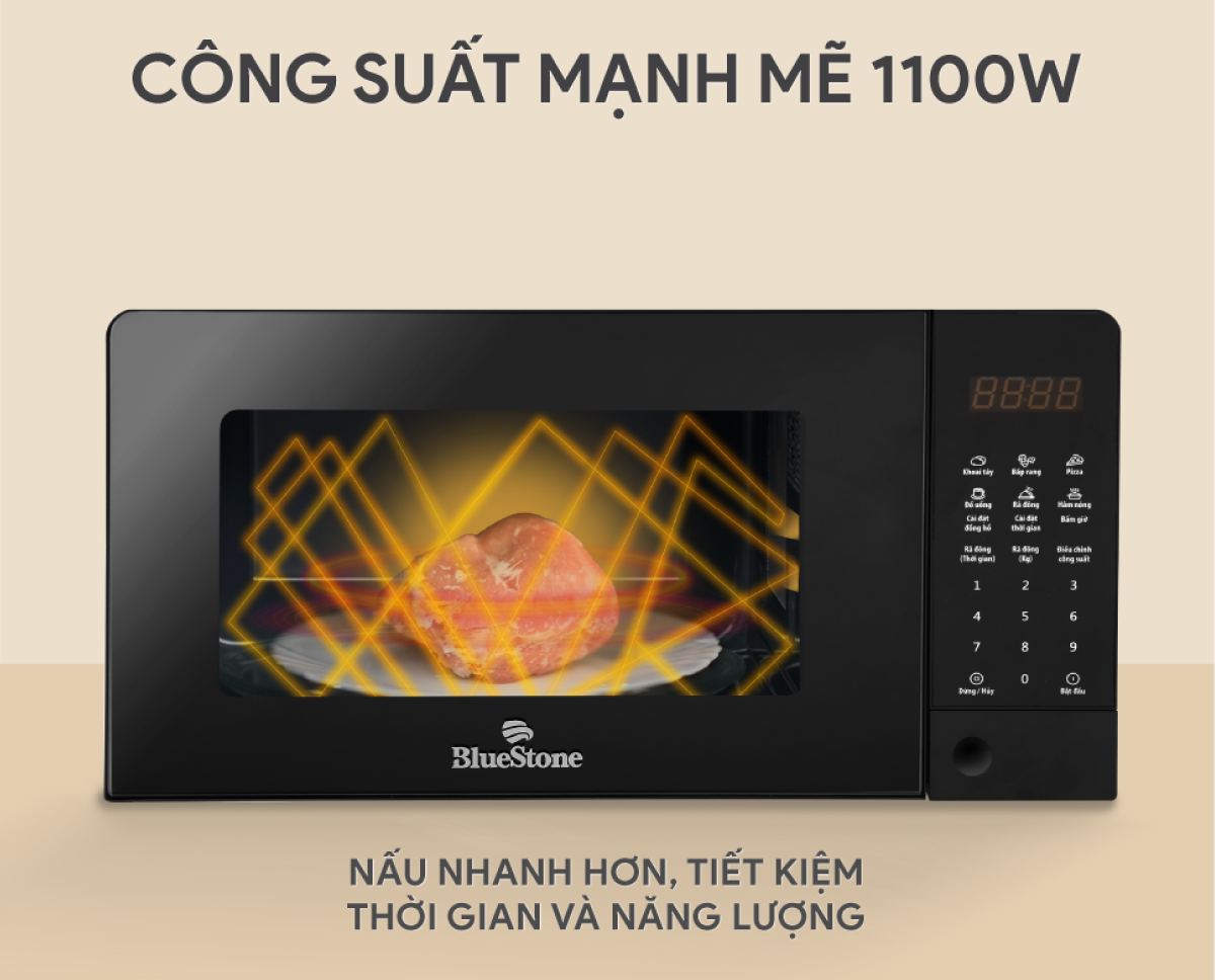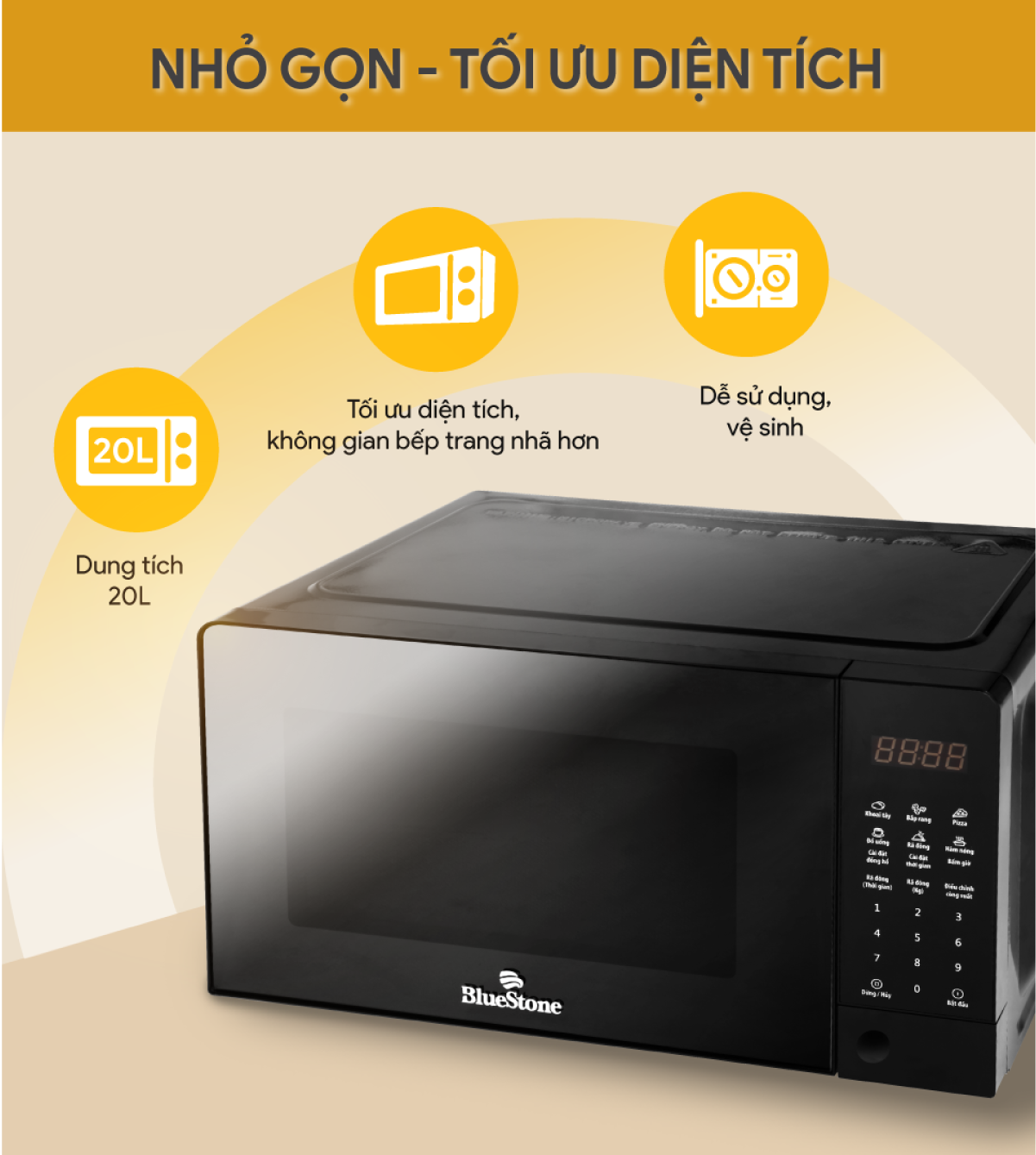 - Công suất lên đến 20L cùng tính năng khóa trẻ em thêm phần an tâm cho người sử dụng Kích thước của lò vi sóng BlueStone là 243x446x323mm và dung tích 20 lít có trang bị khóa trẻ em ngăn ngừa việc tự ý sử dụng của trẻ khi không có sự giám sát của người lớn. Để thiết lập khóa bảng điều khiển: ở chế độ chờ, sau một phút nếu không có tác vụ khởi động nào, lò sẽ tự động thiết lập khóa trẻ em và đèn khóa sẽ được mở, ở giai đoạn khóa tất cả các phím đều bị tắt, đảm bảo an toàn cho trẻ nếu có lỡ nhấn vào cũng không gây nguy hiểm.