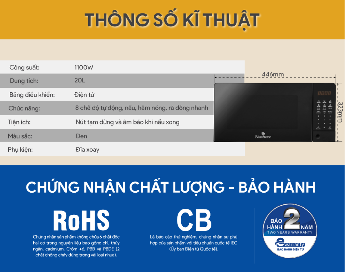 - Chế độ bảo hành Các sản phẩm lò vi sóng của BlueStone đều được bảo hành chính hãng 2 năm tại các trạm bảo hành uy tín của BlueStone trên toàn quốc, xem ngay danh sách các trạm bảo hành của BlueStone TẠI ĐÂY. Bên cạnh các sản phẩm về lò vi sóng, BlueStone còn kinh doanh các mặt hàng điện gia dụng khác như bếp từ, máy làm sữa hạt, nồi chiên không dầu, ấm đun,…. Mời bạn ghé ngay website của chúng mình để xem thêm nhiều sản phẩm hiện đại, đa năng khác nhé.