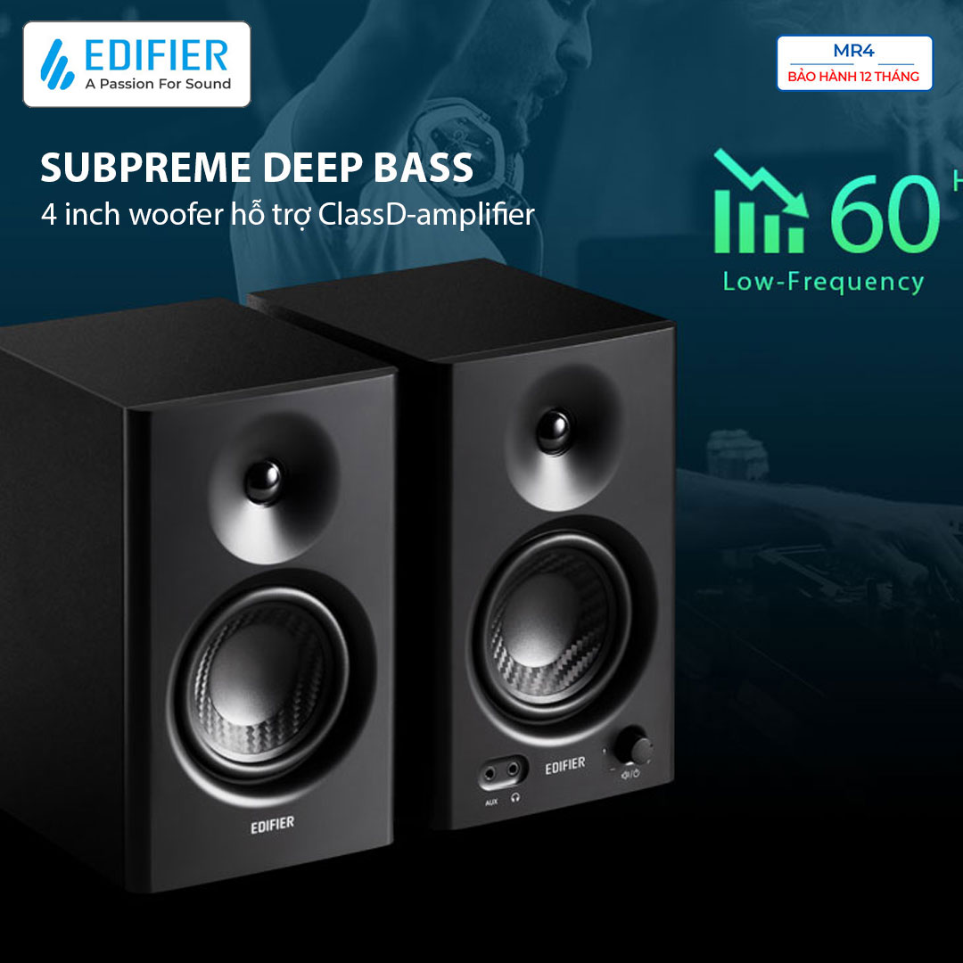 Edifier MR4 là mode loa kiểm âm hiệu chỉnh chuyên nghiệp, đạt chứng nhận tại hệ thống KLIPPEL của Đức. Dễ dàng chuyển đổi giữa chế độ điều chỉnh và chế độ nghe nhạc. Loa tweeter silk dome 1 inch, driver tần số thấp 4 inch và bộ amplifiers công suất 42W Class-D hiệu suất cao mang đến âm thanh tổng thể rõ ràng, mượt mà.