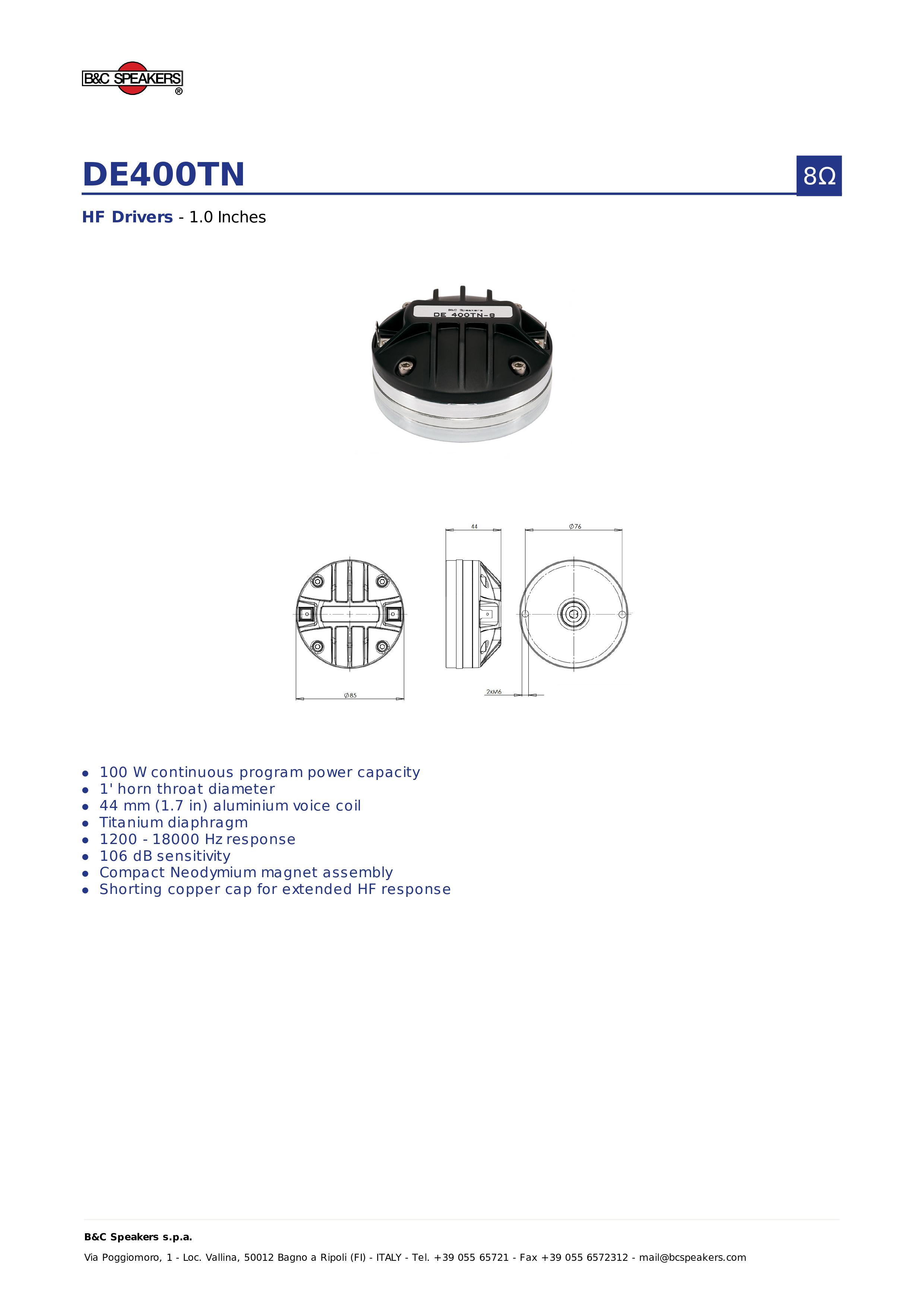 Loa Treble B&C SPEAKERS DE400TN – Hàng Chính Hãng Xuất xứ: Italia Sủ dụng họng 1 Inch ( ME45) Voice coil 44mm (1.7") Công suất: 100w Công suất đỉnh 200 W Dải tần: 1200