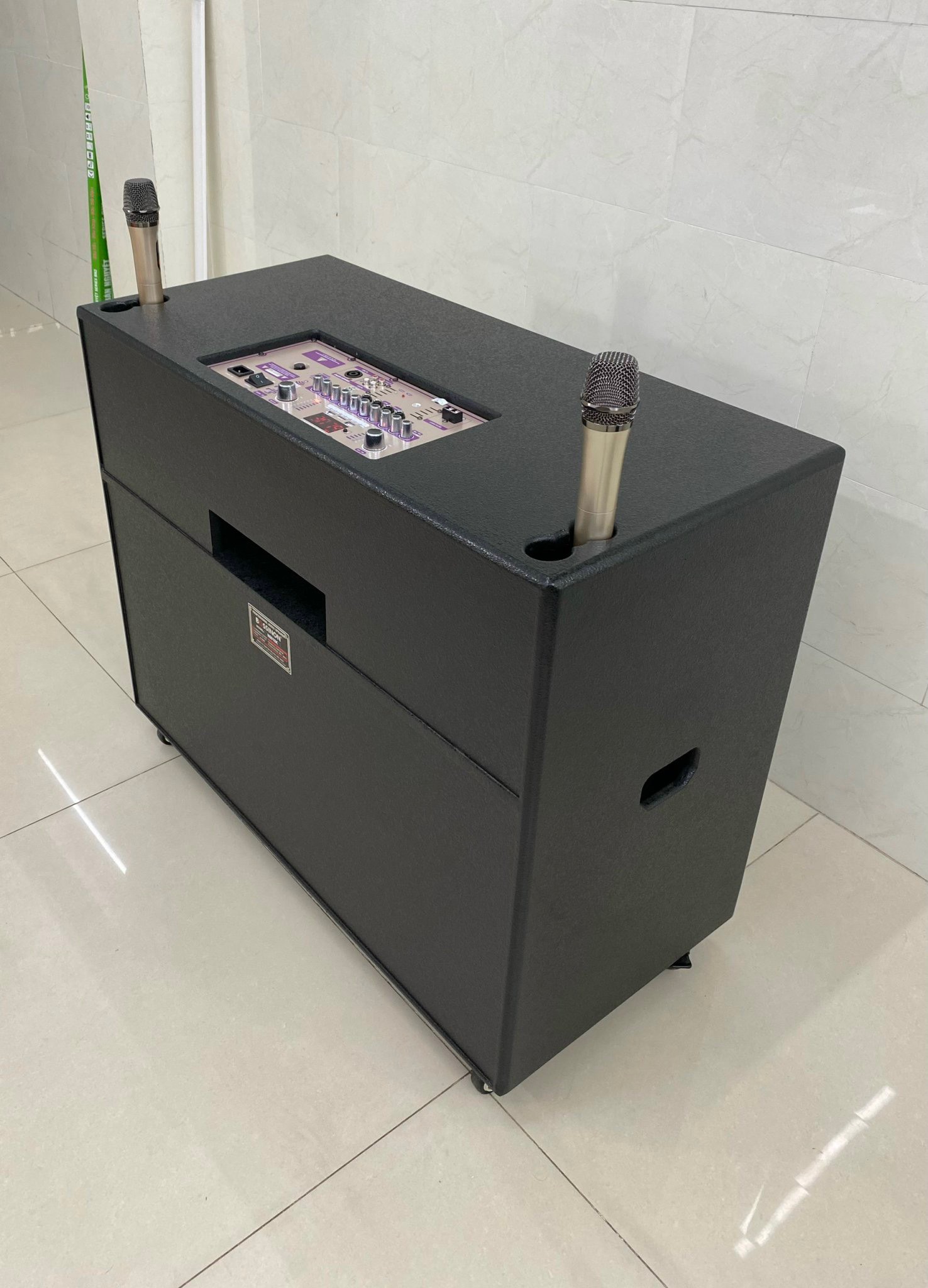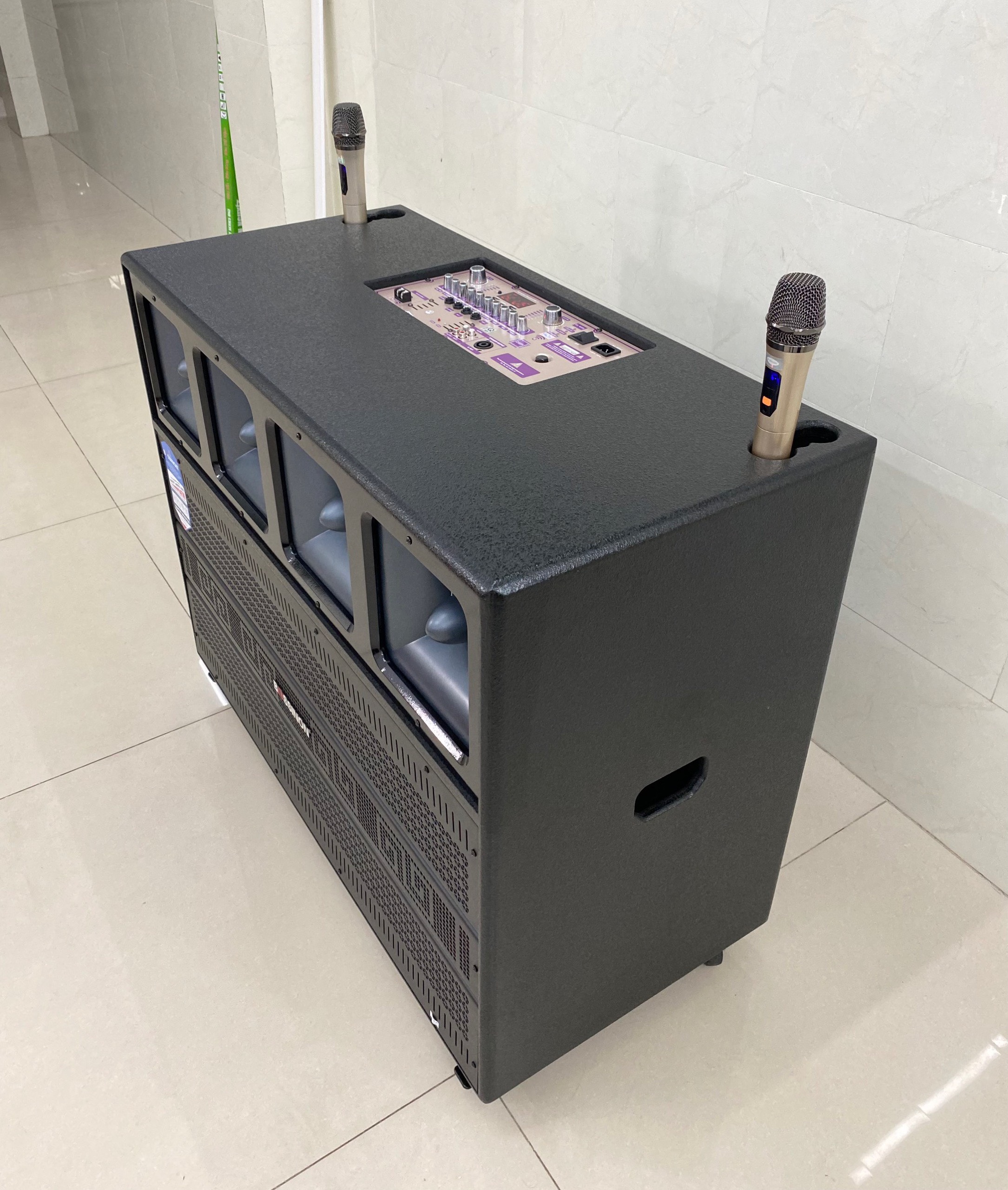 _Nguồn DC 12V bat in, AC _Hỗ trợ USB, SD CARD, Bluetooth, guitar in, mic in _Bass loa ≈40cm X 2, Treble x 1 _Phụ kiện 2 mic cầm tay không dây, dây nguồn _Công