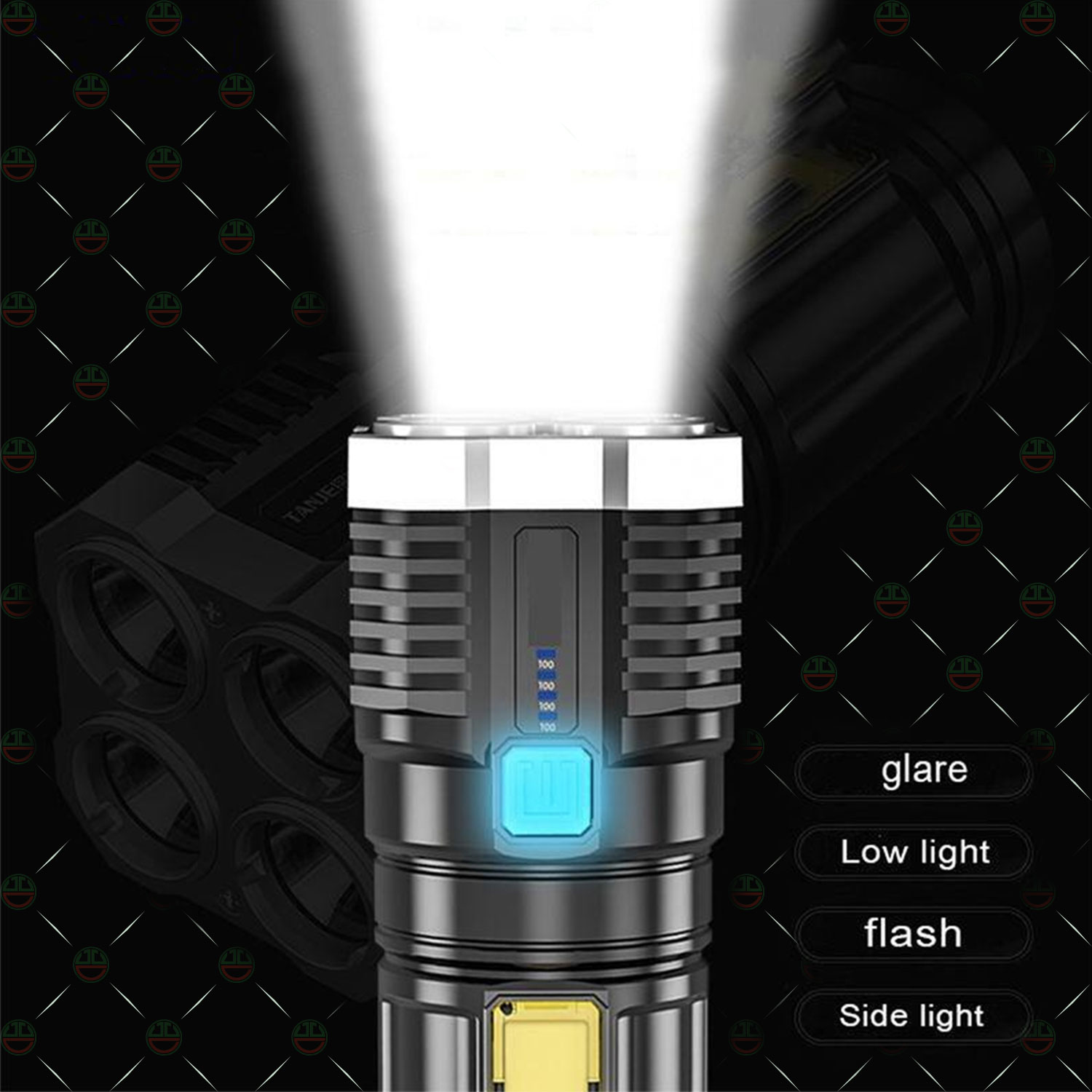 Đèn pin LED đa chức năng có thể sạc lại và nhỏ gọn để sử dụng tại nhà. Pin lithium có thể sạc lại dung lượng lớn tích hợp, nhiều phương pháp sạc USB, phạm vi dài, tuổi thọ pin dài, độ sáng cao, màn hình hiển thị điện thông minh, đèn bên sáng, thích hợp cho ồn điện khẩn cấp khi cúp điện tại nhà. Sản phẩm cao cấp công suất lớn, chống thấm nước, đèn sáng mạnh, có thể chuyển đổi 4 cấp độ theo ý muốn [ánh sáng mạnh-trung bình-ánh sáng nhấp nháy-COB hông] Đặc điểm: