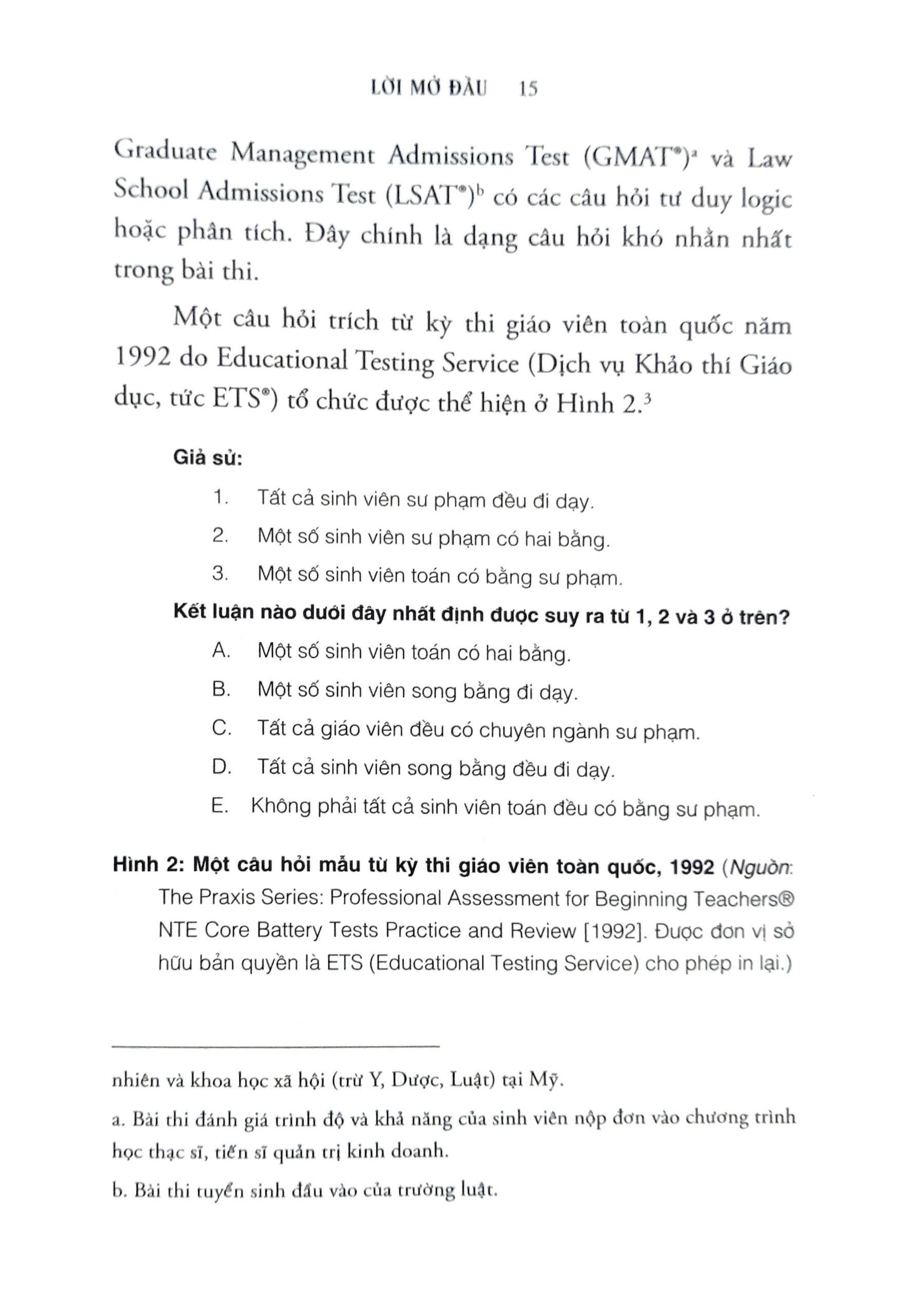 Mua tại TiktokLogic Rất Đơn Giản Qua những tình huống khó khăn cần xử trí trong cuộc sống, những câu hỏi giúp bạn cải thiện điểm thi trong bài GRE, LSAT…, Logic rất đơn giản đã chỉ ra rằng, logic hóa ra không phải là điều bất khả. Cuốn sách này không giống những cuốn sách khác về logic. Ở đây, bạn sẽ hiểu được tại sao tư duy logic lại không hề dễ dàng. Nếu bạn nghĩ m.ình khá logic thì hãy thử một vài câu đố logic mà những người khác thấy khó nhằn. Kể cả nếu bản thân bạn không mắc bẫy tư duy, cuốn sách này cũng sẽ giúp bạn hiểu những khó khăn mà người khác gặp phải. BẠN LOGIC ĐẾN ĐÂU? BẠN CÓ THỂ TRẢ LỜI NHỮNG CÂU HỎI SAU?