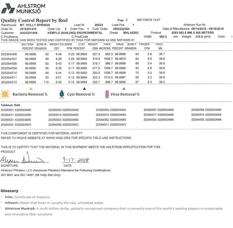 Lõi lọc Nano Disruptor đã được Hiệp hội NSF của Hoa Kỳ thông qua & chứng nhận. Đạt tiêu chuẩn NSF/ANSI 42 và 61 đối với nước uống. Chuẩn NSF 42 là chứng nhận liên quan đến việc cải thiện nước uống bằng cách giảm các chất gây ô nhiễm cụ thể liên quan đến thẩm mỹ hoặc không liên quan đến sức khỏe có thể có trong nước. Chứng nhận này áp dụng cho lọc nước uống.