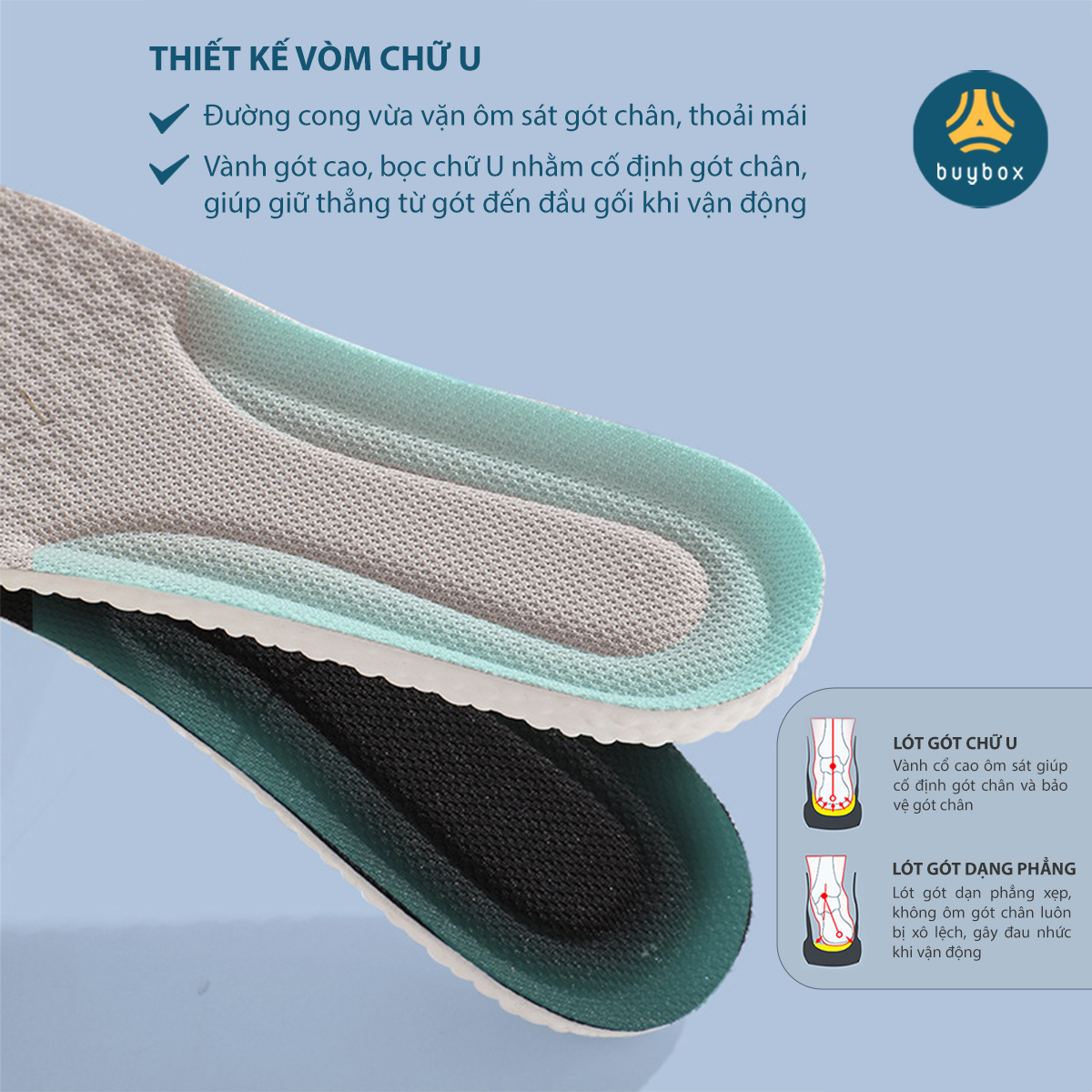 CÔNG DỤNG NỔI BẬC Lót giày đa năng chống rộng buybox là sự kết hợp giữa lót giày và lót chống trầy gót chân. Giúp chống rộng giày, giảm size.