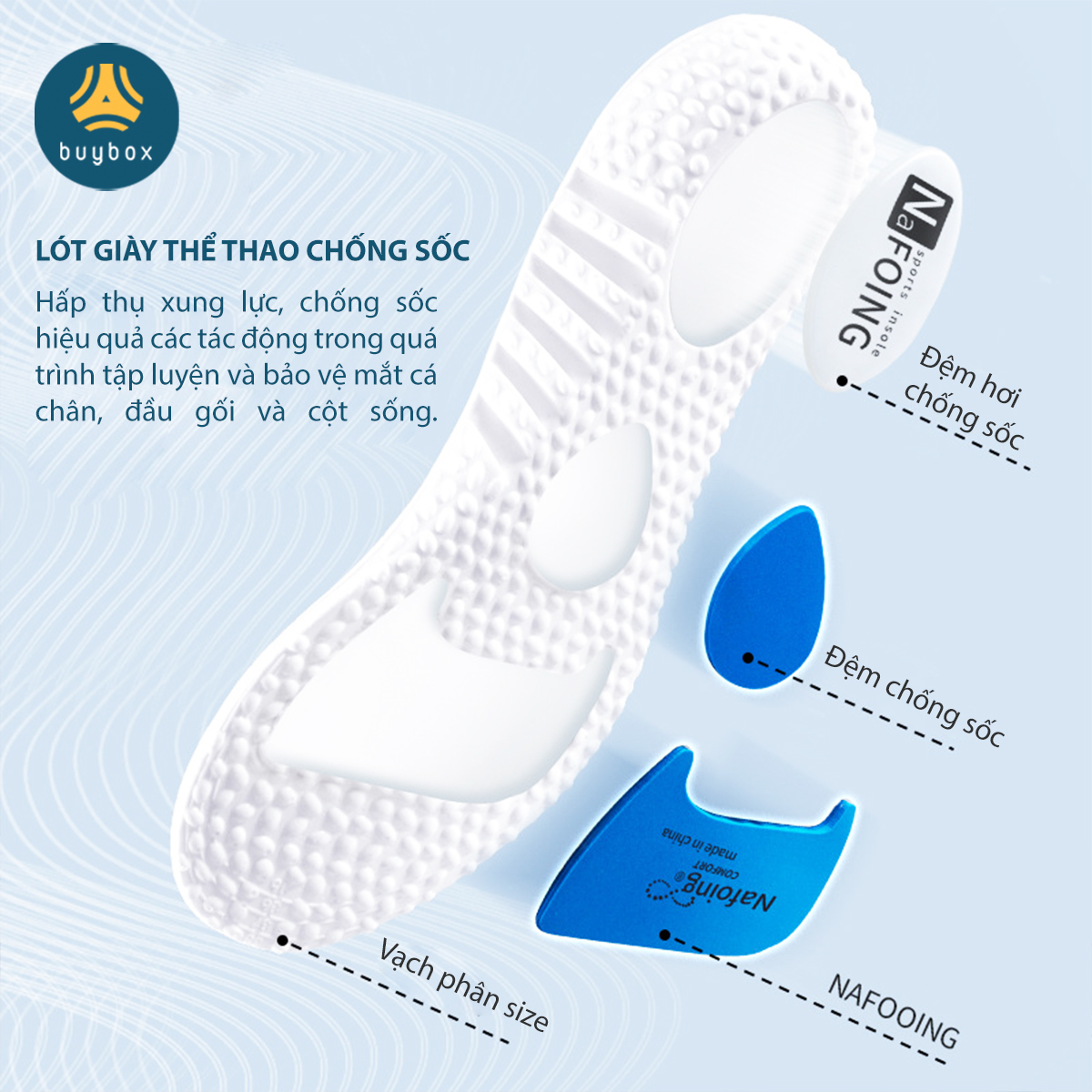 Lót giày thể thao EVA có thiết kế 4D vòm cong lồi-lõm ở mặt trên và bổ sung ốp giảm chấn ở nửa bàn chân sau giúp giảm chấn, bảo vệ sức khỏe đôi chân thật hiệu quả.