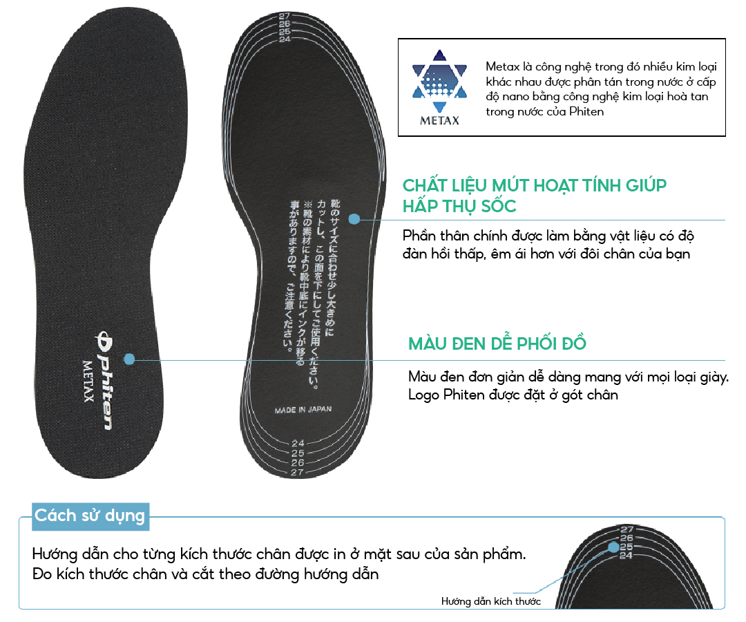 ✨Lót giày trợ lực loại phẳng Phiten metax insole flat type TI463003/TI463004