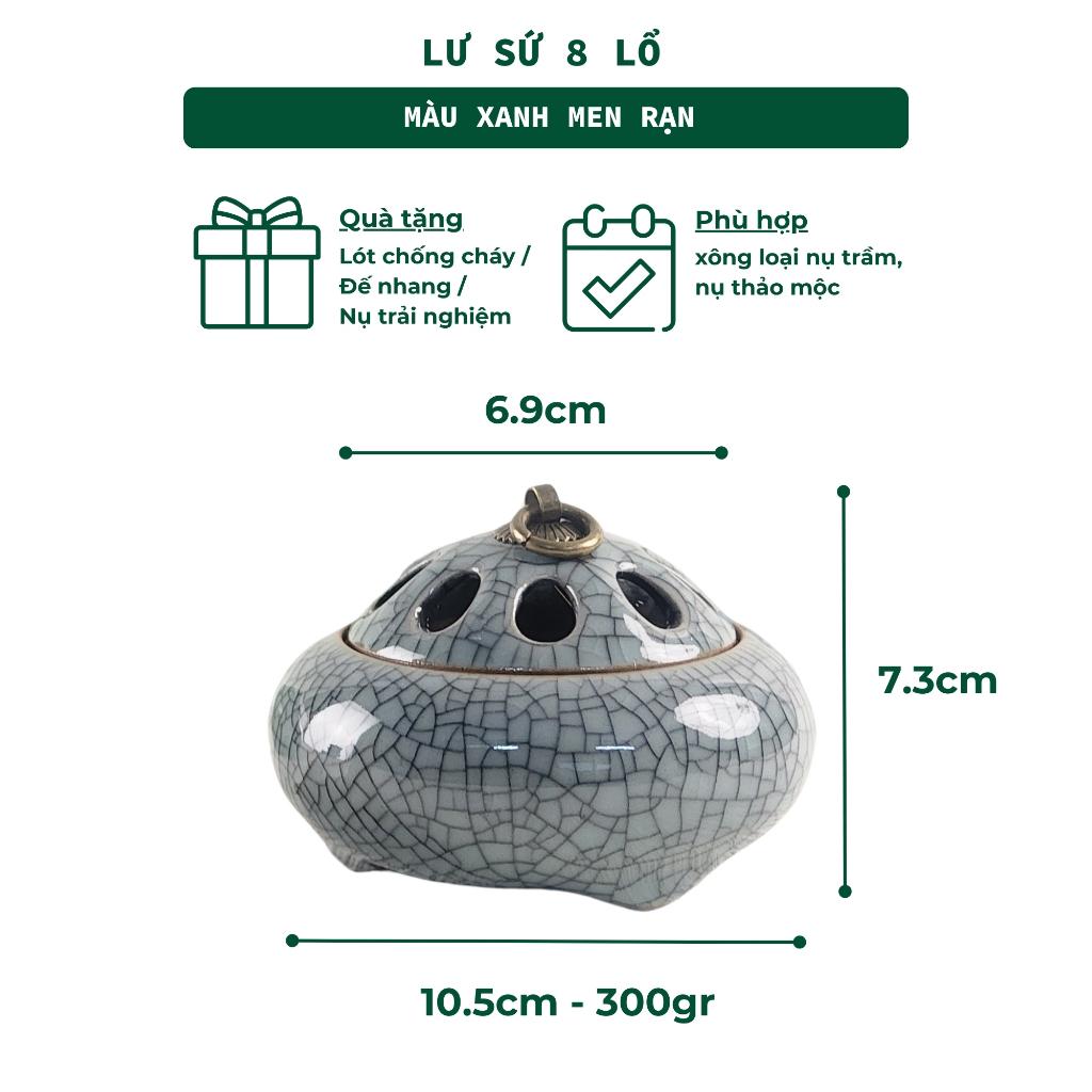 Lư xông nụ trầm hương bằng gốm sứ men cổ cao cấp, nắp đồng hoa văn cổ điển, dùng đốt nụ trầm, nụ thảo mộc, trầm miếng, đá thơm, lá xông. Thiết kế nhỏ gọn, tinh tế, thích hợp cho không gian thiền, phòng ngủ, bàn trà, bàn thờ.