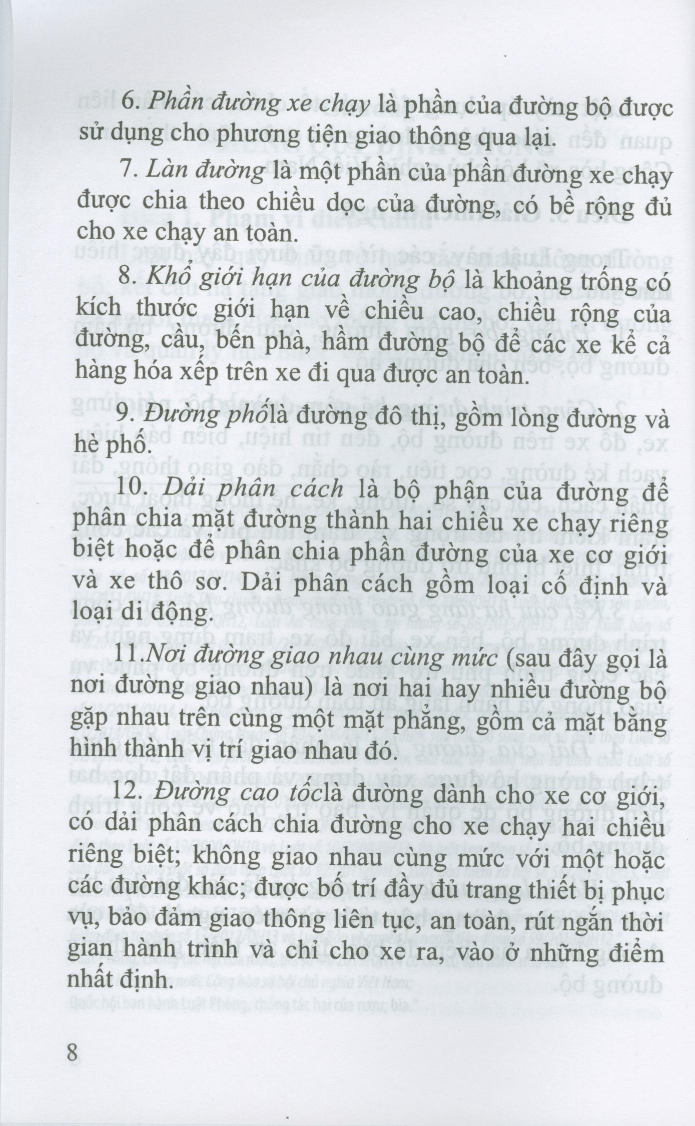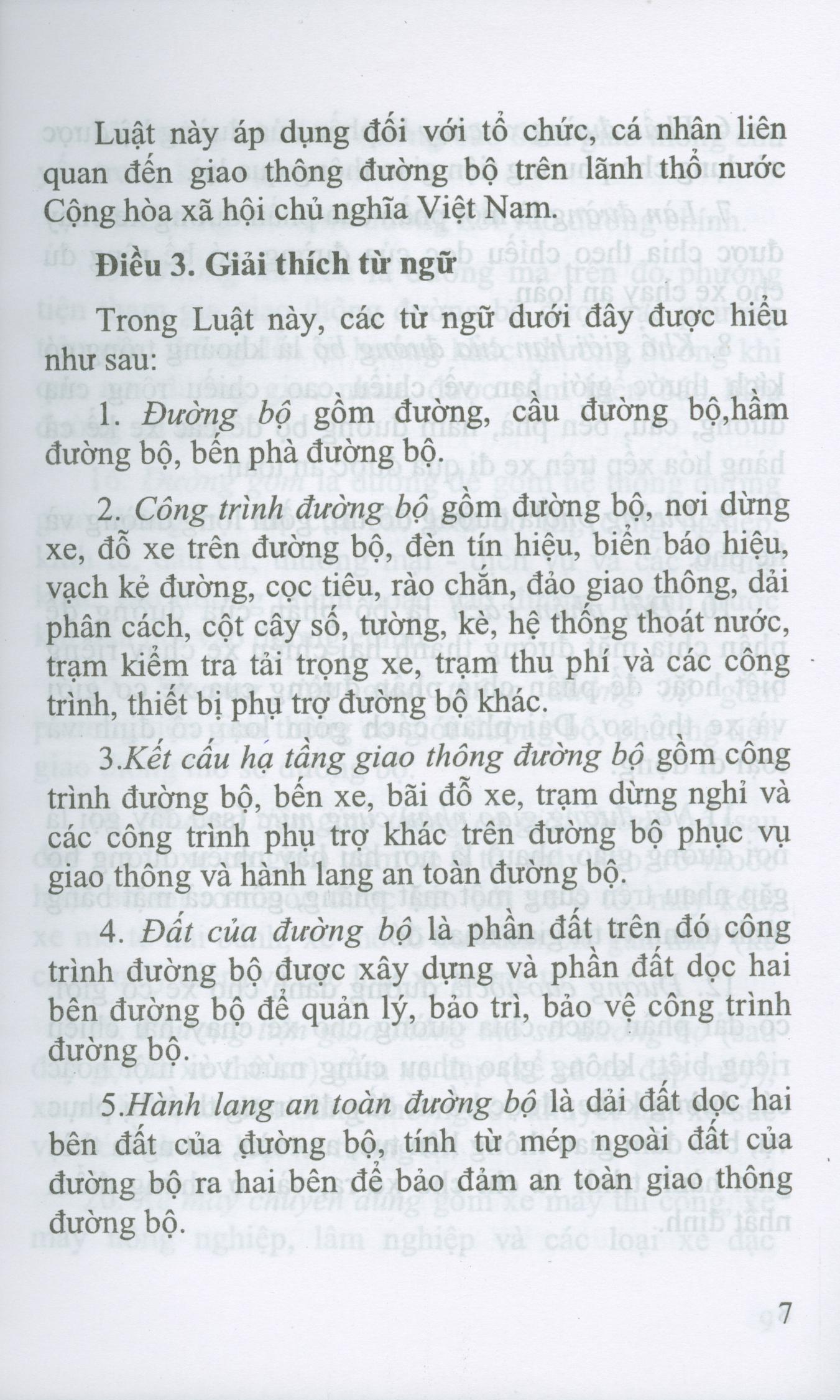 Điều 1. Phạm vi điều chỉnh Luật này quy định về quy tắc giao thông đường bộ; kết cấu hạ tầng giao thông đường bộ; phương tiện và người tham gia giao thông đường bộ; vận tải đường bộ và quản lý nhà nước về giao thông đường bộ. Điều 2. Đối tượng áp dụng Luật này áp dụng đối với tổ chức, cá nhân liên quan đến giao thông đường bộ trên lãnh thổ nước Cộng hòa xã hội chủ nghĩa Việt Nam. Điều 3. Giải thích từ ngữ Trong Luật này, các từ ngữ dưới đây được hiểu như sau: