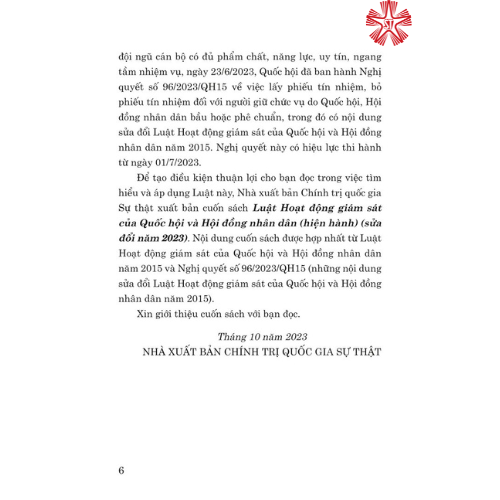 Mua tại TiktokĐể tạo điều kiện thuận lợi cho bạn đọc trong việc tìm hiểu và áp dụng Luật này, Nhà xuất bản Chính trị quốc gia Sự thật xuất bản cuốn sách “Luật Hoạt động giám sát của Quốc hội và Hội đồng nhân dân (hiện hành) (sửa đổi năm 2023)”. Nội dung cuốn sách được hợp nhất từ Luật Hoạt động giám sát của Quốc hội và Hội đồng nhân dân năm 2015 và Nghị quyết số 96/2023/QH15 (những nội dung sửa đổi Luật Hoạt động giám sát của Quốc hội và Hội đồng nhân dân năm 2015).