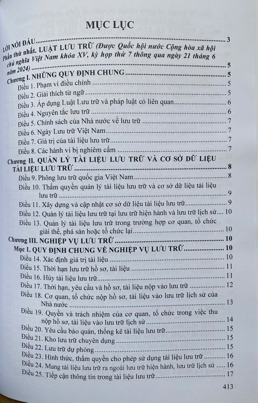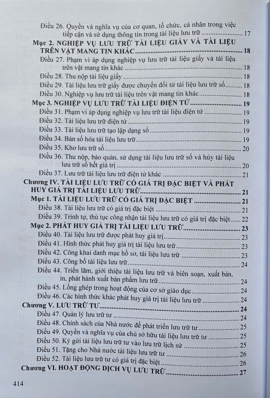 Ngày 21 tháng 6 năm 2024, tại kỳ họp thứ 7, Quốc hội khóa XV đã thông qua Luật Lưu trữ. Nhằm giúp việc quản lý và nâng cao nghiệp vụ của công tác văn thư, lưu trữ trong việc soạn thảo, ký ban hành văn bản; quản lý văn bản; lập hồ sơ và nộp lưu hồ sơ, tài liệu vào Lưu trữ cơ quan, hướng dẫn hoạt động thu thập, chỉnh lý, xác định giá trị, thời hạn bảo quản, thống kê, sử dụng tài liệu lưu trữ. Nội dung cuốn sách bao gồm những phần sau: -Phần thứ nhất. LUẬT LƯU TRỮ (được Quốc hội nước Cộng hòa xã hội chủ nghĩa Việt Nam khóa XV, kỳ họp thứ 7 thông qua ngày 21 tháng 6 năm 2024) -Phần thứ hai. NGHIỆP VỤ CÔNG TÁC VĂN THƯ -Phần thứ ba. BẢNG THỜI HẠN BẢO QUẢN HỒ SƠ, TÀI LIỆU Luatvietbook xin giới thiệu cuốn sách đến bạn đọc!