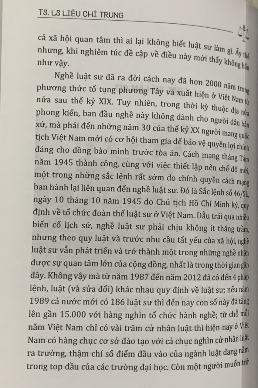Là người tâm huyết với nghề, sau hàng chục năm làm báo và hành nghề luật sư, lần này Luật sư Liêu Chí Trung cho ra mắt cuốn sách “Luật sư và nghề luật sư ở Việt Nam”. Sách dày hơn 400 trang do Nhà xuất bản Lao động xuất bản, được tập hợp từ những bài viết của tác giả, trong đó hầu hết đã đăng trên Tạp chí Luật sư Việt Nam và hoạt động liên quan đến các nhân vật, sự kiện cụ thể. Bên cạnh đó, do tác giả có thời gian dài gắn bó với công tác truyền thông của Liên đoàn Luật sư Việt Nam và với tình cảm, trách nhiệm nghề nghiệp, cuốn sách còn cung cấp đến bạn đọc nhiều thông tin, tư liệu, hình ảnh quý về quá trình phát triển của nghề luật sư và hoạt động của Liên đoàn Luật sư Việt Nam.