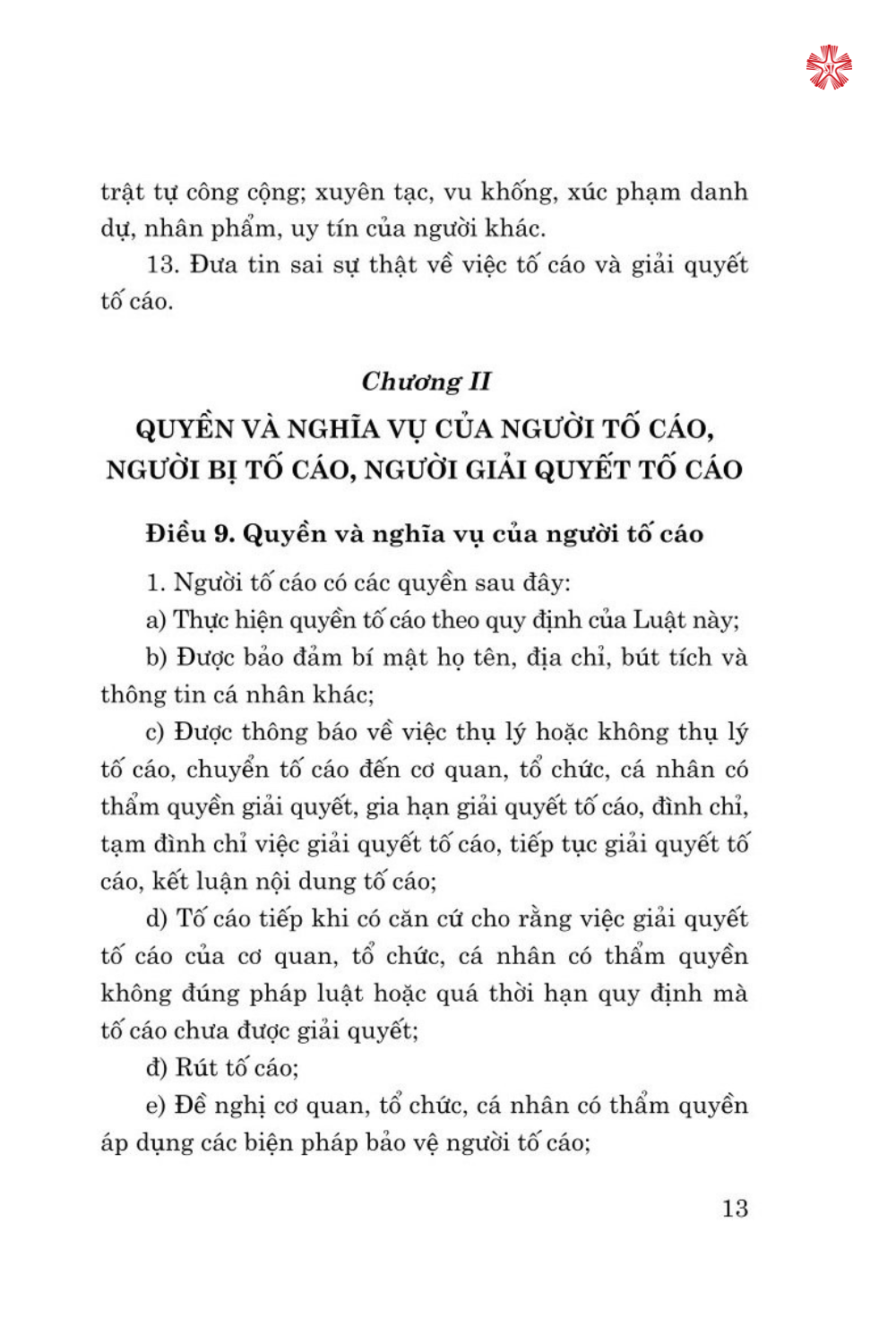 Chương 2: Quyền và nghĩa vụ của người tố cáo, người bị tố cáo, người giải quyết tố cáo.