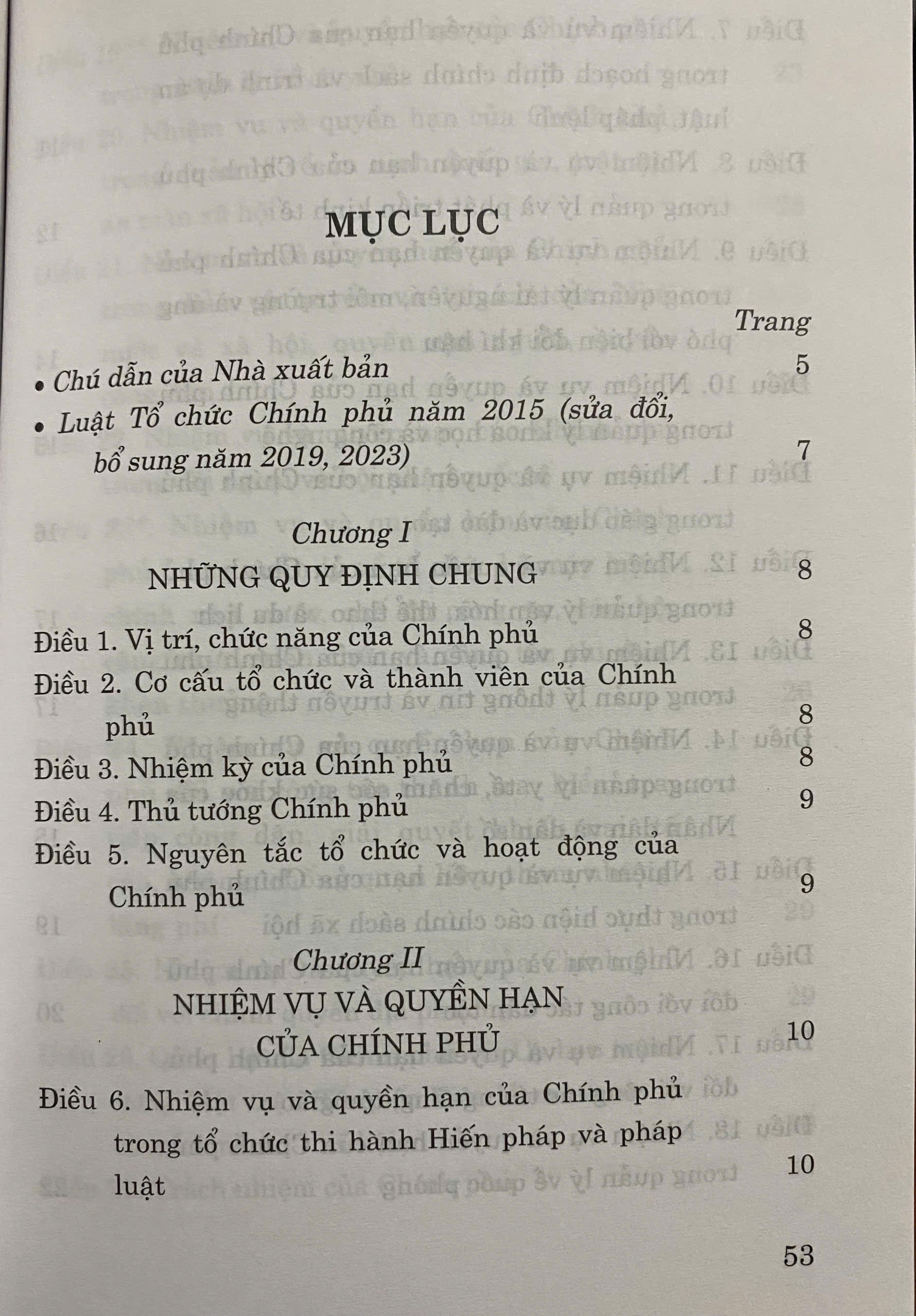Để tạo điều kiện thuận lợi cho bạn đọc trong việc tìm hiểu và áp dụng Luật, Nhà xuất bản Chính trị quốc gia Sự thật xuất bản cuốn sách Luật Tổ chức Chính phủ năm 2015 (sửa đổi, bổ sung năm 2019, 2023). Nội dung cuốn sách là văn bản được hợp nhất từ Luật Tổ chức Chính phủ năm 2015; Luật sửa đổi, bổ sung một số điều của Luật Tổ chức Chính phủ và Luật Tổ chức chính quyền địa phương năm 2019; Luật Giao dịch điện tử năm 2023 (nội dung sửa đổi Luật Tổ chức Chính phủ năm 2015).
