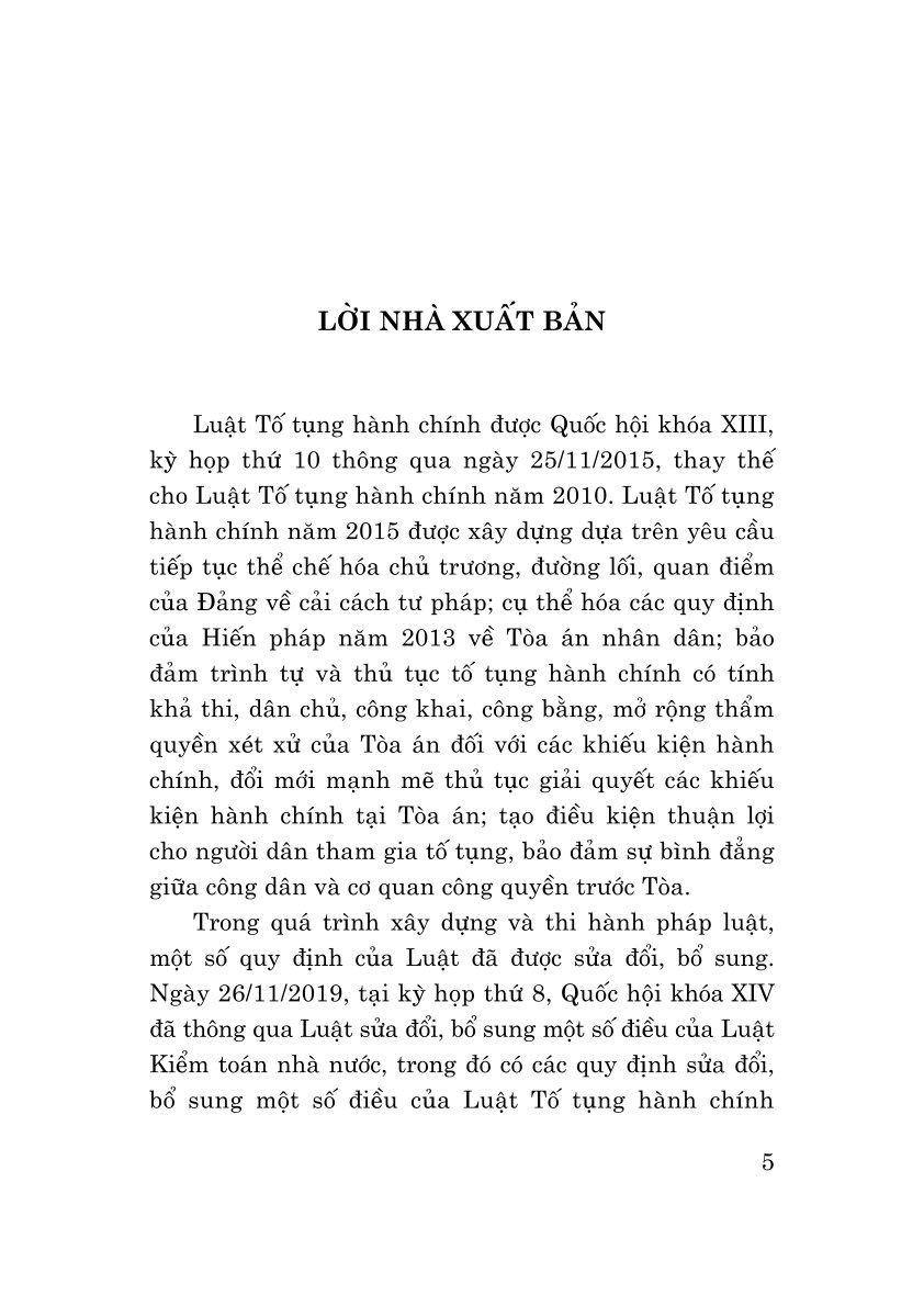 Luật Tố tụng hành chính số 93/2015/QH13 được Quốc hội khóa XIII thông qua ngày ngày 25-11-2015, được sửa đổi, bổ sung theo Luật Kiểm toán nhà nước số 55/2019/2014 ngày 20-11-2019, Luật Tố