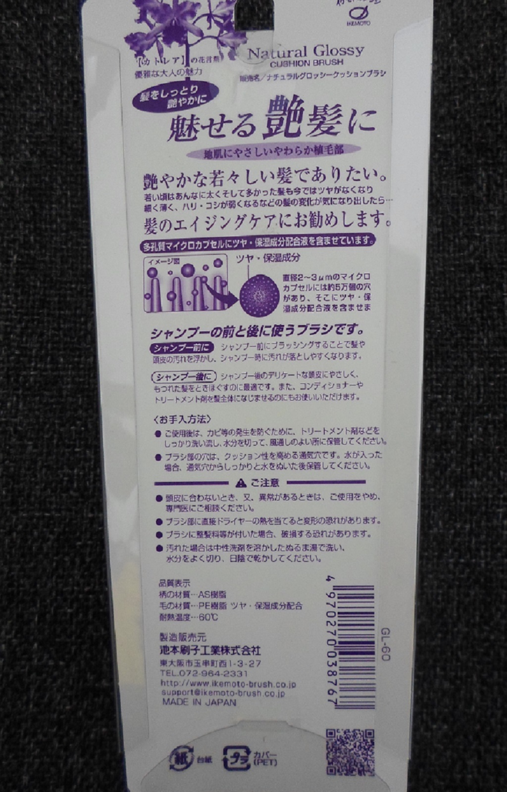 - Tinh dầu Argan và tinh dầu Jojoba được tẩm trên tấm lưới chứa khoảng 50000 viên xốp siêu nhỏ đường kính 2 - 3 µm ép dưới phần răng lược chải giúp thẩm thấu dễ dàng vào từng nang tóc. ▼THÔNG SỐ LƯỢC IKEMOTO GL60 Mã hàng (model) : GL60 Trọng lượng : 43g Công dụng chính : Lược chống tĩnh điện trên tóc Bổ sung tinh dầu quý : Tinh dầu hạt Argan và Jojoba Khả năng chịu nhiệt : 60˚C Kích thước lược : Rộng 50mmCao 159mm36mm. Chất liệu răng lược : Nhựa silicon mềm mại, massage da đầu Thời gian sử dụng tinh dầu trong lược : 1.5 năm (40 lần chải mỗi ngày) Thương hiệu : IKEMOTO Xuất xứ : Nhật Bản ▼HƯỚNG DẪN SỬ DỤNG