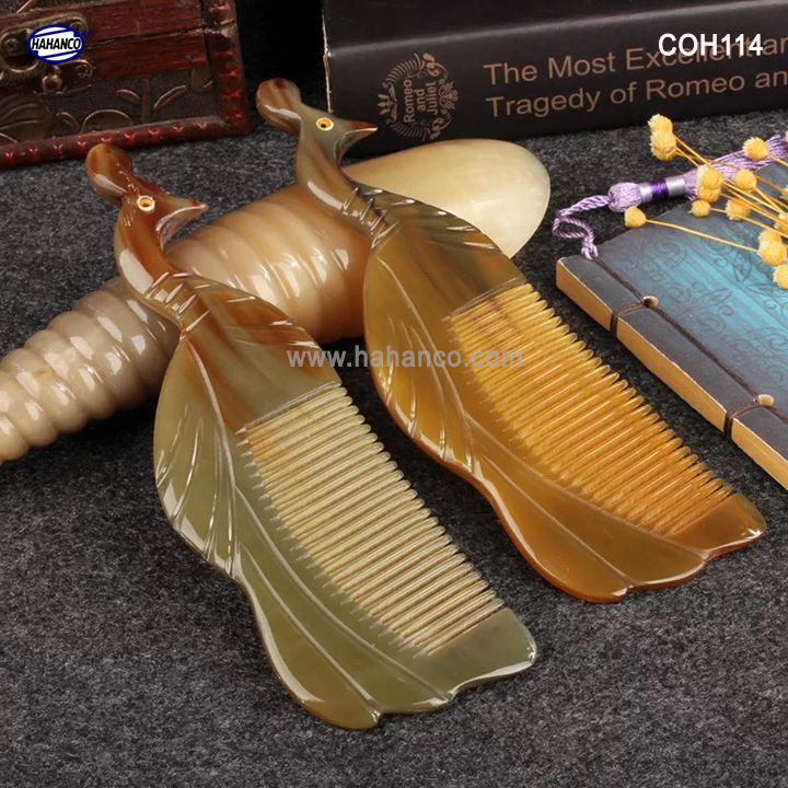 Mua tại TiktokLược sừng xuất khẩu sang thị trường Nhật Bản, EU, US. Lược sừng hình Công trong bộ sưu tập các con vật, con giáp. COH114 được các nghệ nhân làm thủ công tạo hình con Công và tỉa tách những chi tiết nhỏ rất đẹp, chiếc lược dày dặn và làm bóng bảy rất kỹ. Được tỉa hình hai mặt giống nhau. Mẫu lược này được sản xuất nhiều công đoạn phức tạp, các đường nét khía sâu vào thân lược rất tỉ mỉ và chi tiết, uốn lượn tinh xảo. Những chiếc răng lược được các bàn tay khéo léo mài dũa từng chiếc một cẩn thận để đạt được độ nhẵn bóng, khi chải tóc sẽ không làm gãy và rụng tóc. Mô tả sản phẩm: