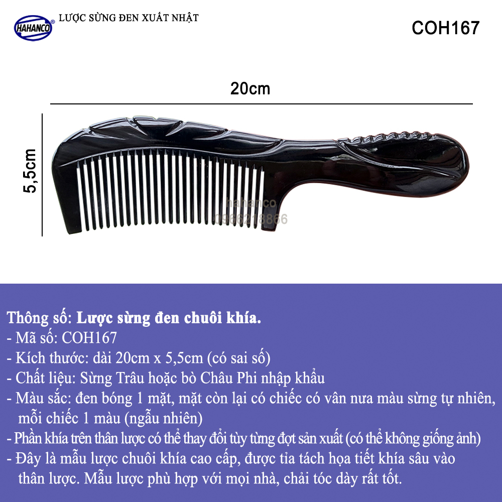 - Đây là mẫu lược sừng đen chuôi khía VIP, kích thước chuẩn và phổ thông hầu hết trên những chiếc lược, phù hợp với toàn bộ người sử dụng, có thể để bàn trang điểm rất sang. Sản xuất với nhiều công đoạn phức tạp, Được các nghệ nhân của HAHANCO thổi hồn vào chiếc lược này, tạo ra các họa tiết và đường nét uốn lượn sắc sảo, làm cho chiếc lược cổ điển không còn nhàm chán mỗi khi bạn cầm trên tay. Những chiếc răng lược được các bàn tay khéo léo mài dũa từng chiếc một cẩn thận để đạt được độ nhẵn bóng, khi chải tóc sẽ không làm gãy và rụng tóc, ai đã từng qua Nhật sẽ thấy những chiếc lược này không thể thiếu trong mỗi gia đình. MÔ TẢ SẢN PHẨM: