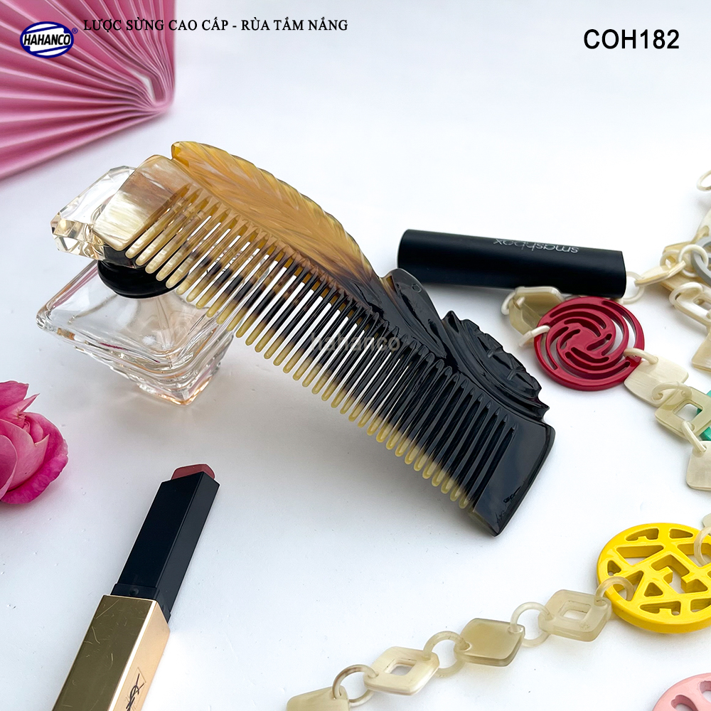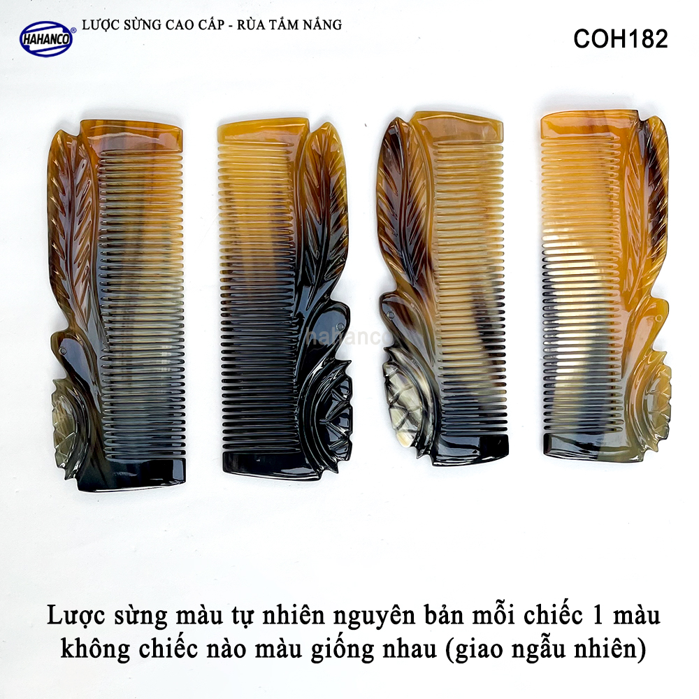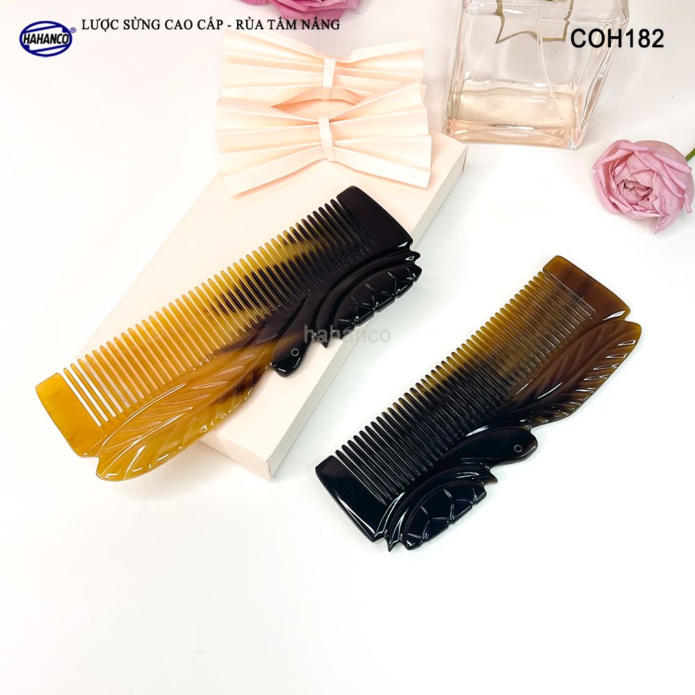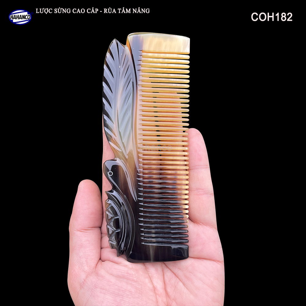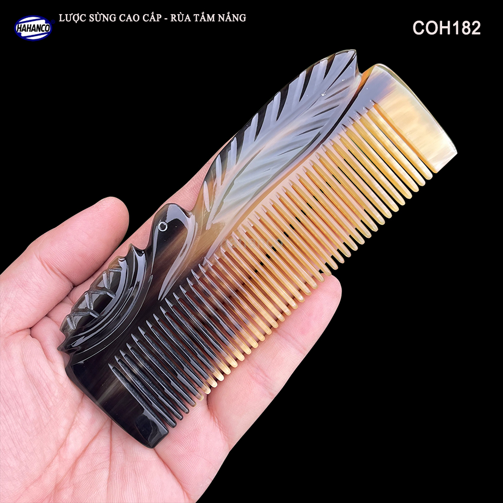 - Đây là mẫu lược sừng vân nưa cao cấp có thể bỏ túi, Được các nghệ nhân của HAHANCO làm thủ công tạo hình Rùa nằm trên lá, cắt khía vào thân lược tạo ra các đường nét uốn lượn với những đường tỉa tách họa tiết sống động sắc sảo trên thân lược.