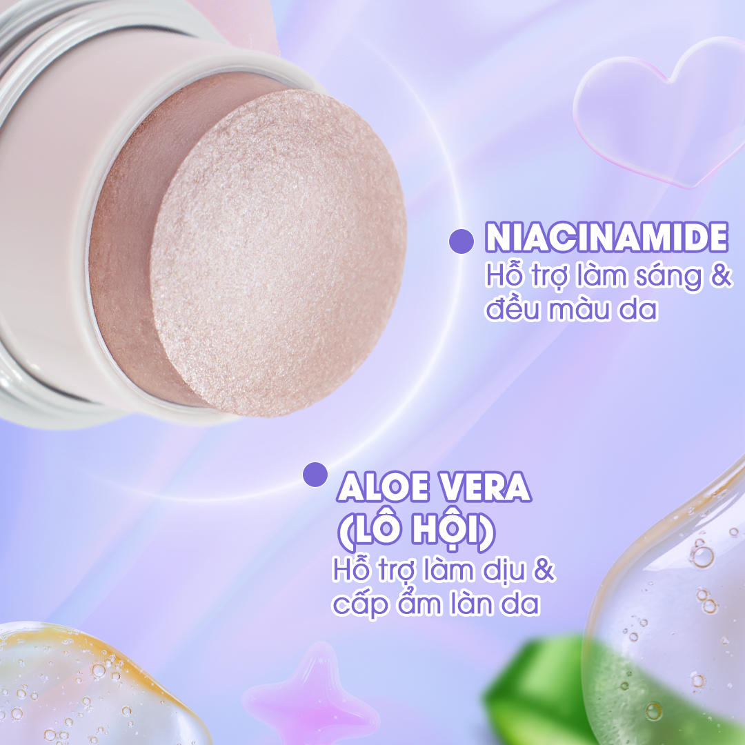 - Sản phẩm có thể sử dụng cho gương mặt và cơ thể hoặc bất cứ nơi nào cần bắt sáng. Sản phẩm có chứa Niacinamide và Lô hội giúp dưỡng da và hỗ trợ kiềm dầu. THÀNH PHẦN