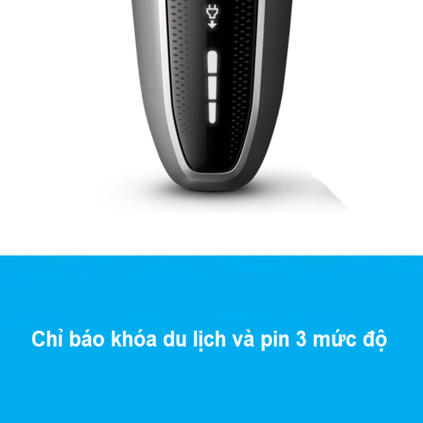 - Trên thân máy cạo râu tích hợp 3 mức đèn hiện thị rõ ràng giúp người dùng nắm được tình trạng chính xác của máy để có thể sử dụng một cách hiệu quả nhất gồm có: 3 mức pin chỉ báo và đèn báo khóa.
