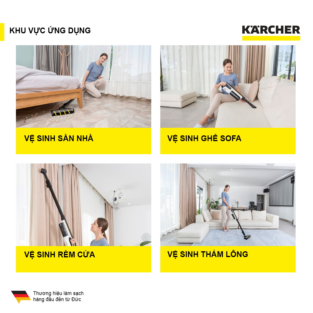 - Karcher mang đến giải pháp làm sạch toàn diện từ vệ sinh sân vườn, vệ sinh nhà cửa cho đến xe, các dụng cụ, vệ sinh bể bơi, vệ sinh toilet...