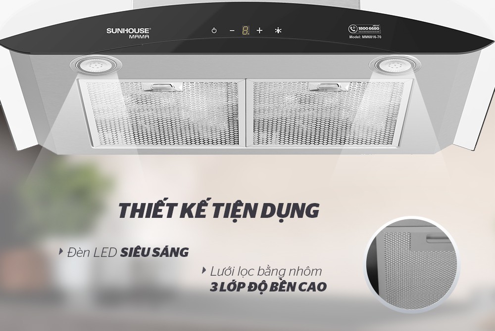 - Vỏ chất liệu inox và kính cao cấp, không han gỉ, độ bền cao Không chỉ giúp tránh được những mùi khói, thức ăn khi nấu mà còn có thể làm sạch, lọc bầu không khí, đảm bảo sức khỏe cho mọi thành viên trong gia đình, máy hút mùi dần trở thành thiết bị không thể thiếu trong mỗi căn bếp hiện đại ngày nay. Hiểu được nhu cầu thiết yếu đó, SUNHOUSE đã cho ra mắt thị trường mẫu máy hút mùi kính cong SUNHOUSE MAMA MMB6682-70 với công suất mạnh mẽ và thiết kế đặc biệt phù hợp với mọi căn bếp của người Việt.