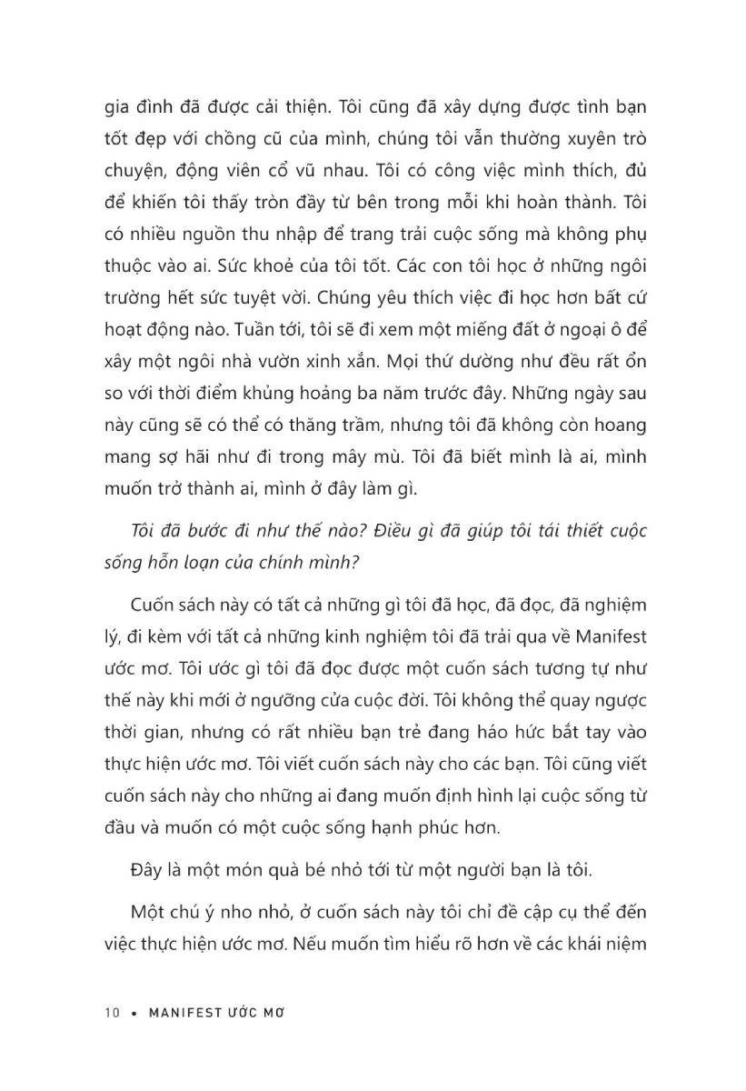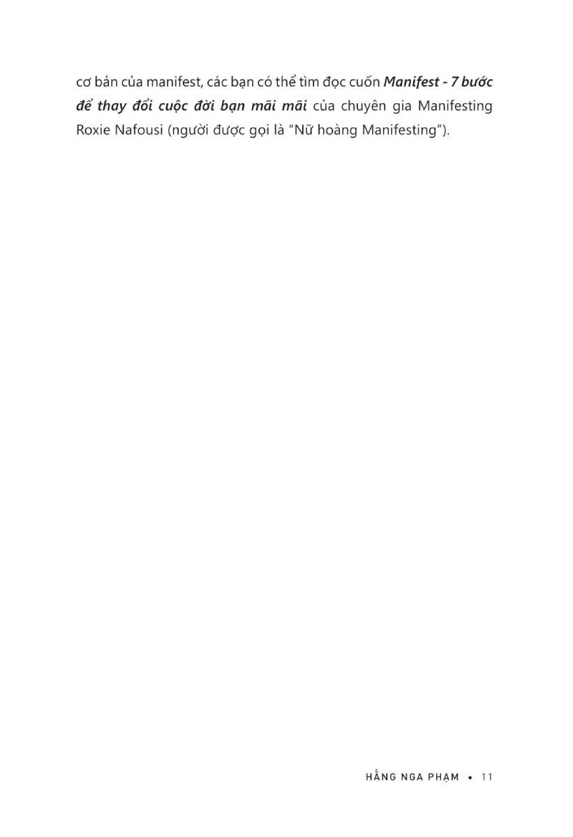 Manifest Ước Mơ - Biến Mọi Khát Khao Thành Hiện Thực Đây là một cuốn sách nói về ước mơ. Bạn có ước mơ nào không? Rất nhiều người sẽ ngay lập tức không do dự mà trả lời là “Có”. Luôn có những ước mơ được vun đắp từ thuở nhỏ, cũng có những ước mơ được hình thành trong quá trình lớn lên của một người. Nhưng không phải ai cũng có may mắn xác định được đúng ước mơ của mình, hoặc hiểu rõ về bản chất của ước mơ và cách ứng dụng các quy luật của vũ trụ để hỗ trợ hành trình đạt được ước mơ đó. Tác giả Hằng Nga Phạm cũng thế. Cô từng trải qua rất nhiều thăng trầm trong sự nghiệp, tình yêu và cuộc sống nói chung để đạt được điều cô khao khát nhất ở thời điểm hiện tại: sự tự do đích thực. Tự do tài chính, tự do trong mọi quyết định, tự do sống theo ý muốn. “Cuốn sách này có tất cả những gì tôi đã học, đã đọc, đã nghiệm lý, đi kèm với tất cả những kinh nghiệm tôi đã trải qua về Manifest ước mơ. Tôi ước gì tôi đã đọc được một cuốn sách tương tự như thế này khi mới ở ngưỡng cửa cuộc đời. Tôi không thể quay ngược thời gian, nhưng có rất nhiều bạn trẻ đang háo hức bắt tay vào thực hiện ước mơ. Tôi viết cuốn sách này cho các bạn. Tôi cũng viết cuốn sách này cho những ai đang muốn định hình lại cuộc sống từ đầu và có một cuộc sống hạnh phúc hơn.”