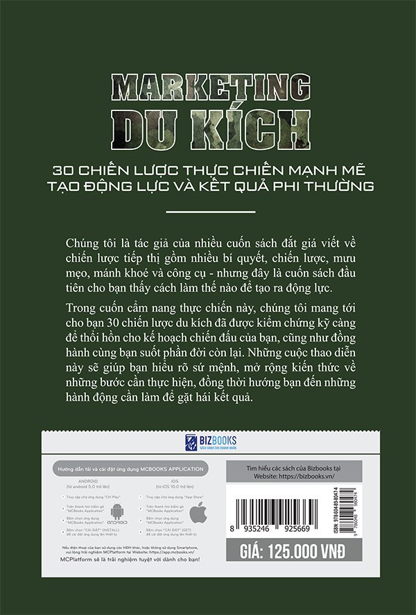 Sau khi đọc cuốn sách Marketing du kích thực chiến này, bạn sẽ có được những chiến lược thực chiến mạnh mẽ để giảm chi phí, tăng hiệu quả và tạo ra lợi nhuận tối ưu. Những dòng chỉ dẫn trong những trang sách này sẽ cho bạn kiến thức bạn cần để chiến đấu với sự tự tin cao nhất.