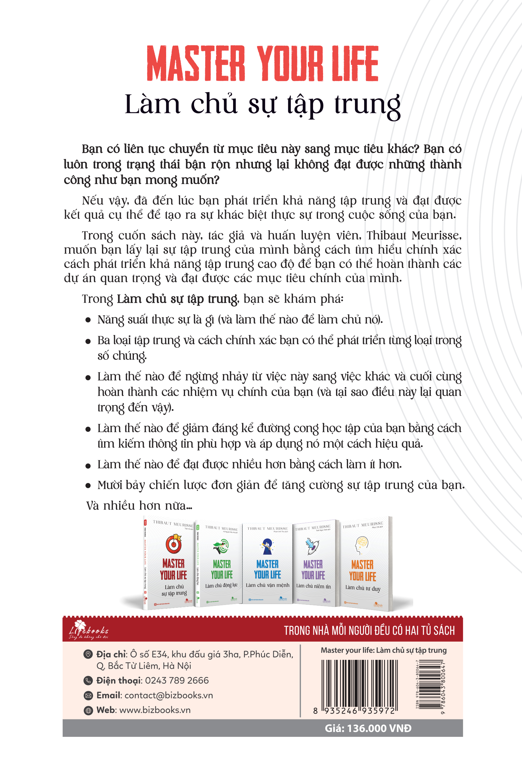 Master your life - Làm chủ sự tập trung được tạo ra để giúp bạn hiểu lý do tại sao bạn cứ tiếp tục nhảy từ thứ này sang thứ khác mà không bao giờ đạt được những kết quả đúng tiềm năng của mình. Chúng sẽ giúp bạn biết cách duy trì sự tập trung tư tưởng và tránh đuổi theo những điều bạn cho rằng lớn lao bỗng bất chợt nảy ra trong đầu như: chế độ ăn kiêng thú vị tiếp theo, ý tưởng dường như tuyệt vời kế tiếp, khóa học nghe có vẻ hay ho…