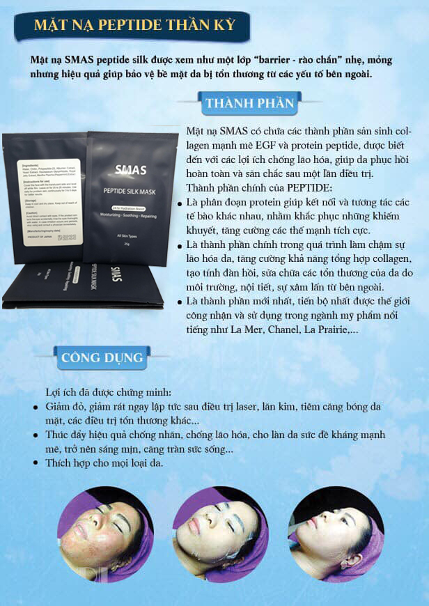 Giới thiệu mặt nạ SMAS Peptide - SMAS là mặt nạ phục hồi da giúp dưỡng ẩm, làm dịu và giảm kích ứng da, đồng thời tái tạo da, giúp da phục hồi nhanh chóng