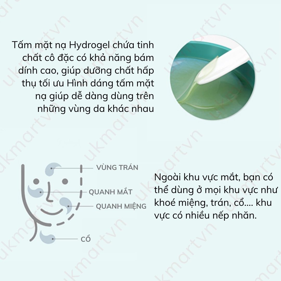 - Đắp mặt nạ lên mắt hoặc khoé miệng 15-20 phút. Tháo mặt nạ ra, vỗ nhẹ để tinh chất thấm vào da.