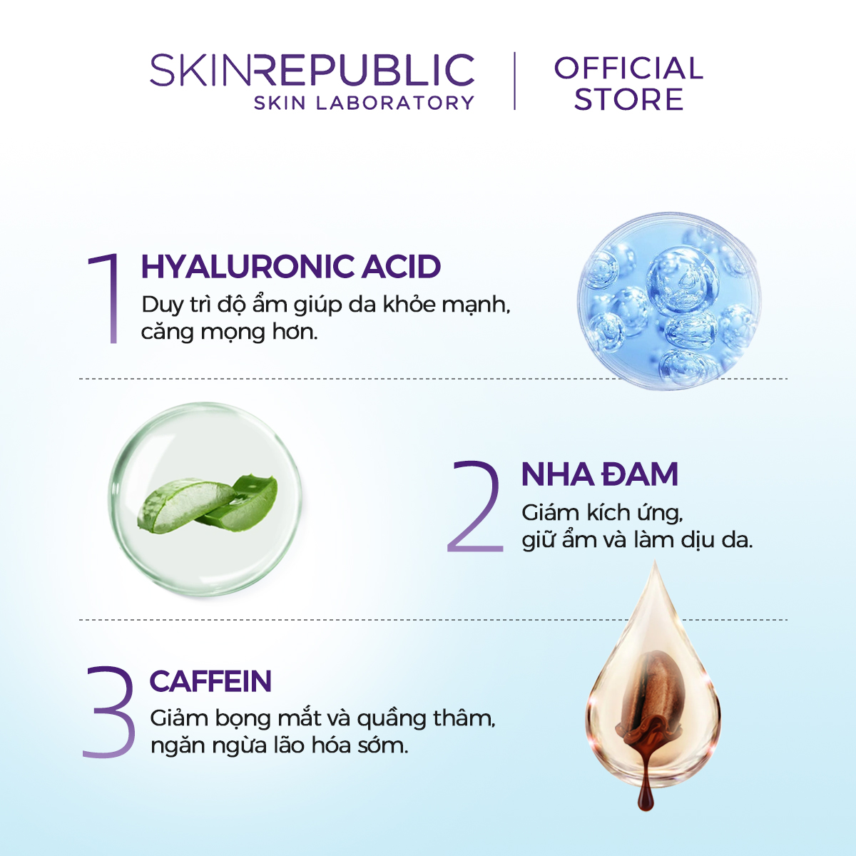 - Hyaluronic Acid Các phân tử Hyaluronic Acid có khả năng giữ nước gấp 1000 lần trọng lượng của chính mình và là thành phần chính tạo nên cấu trúc da của da, duy trì làn da khỏe mạnh và mịn màng. Hyaluronic Acid giúp cải thiện độ ẩm cho làn da của bạn đồng thời củng cố hàng rào bảo vệ da, giúp làn da của bạn trông mềm mại, mịn màng hơn và căng mọng hơn.