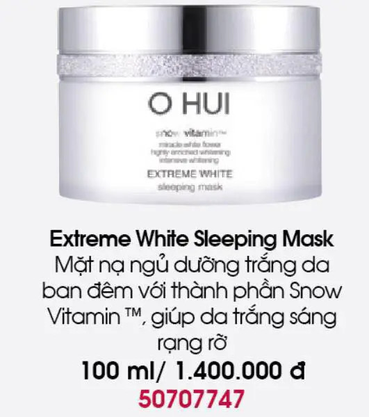 - Thiết kế vỏ bạc sang trọng và đẹp mắt. Mặt nạ ngủ dưỡng trắng da Ohui Extreme White Sleeping Mask giúp phục hồi và tái sinh làn da mệt mỏi, tối màu, dưỡng trắng sâu cho làn da trắng trong, ẩm mịn sau khi thức dậy.