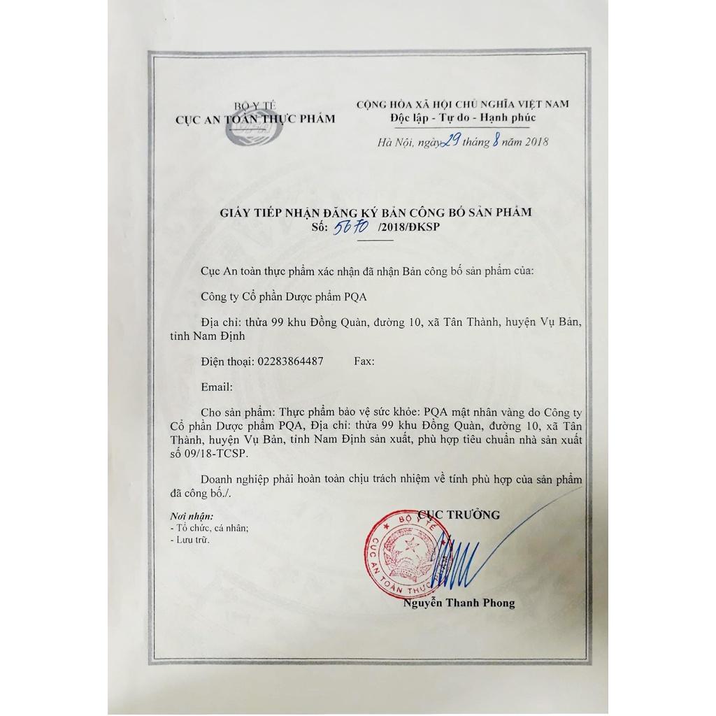- Địa chỉ sản xuất: Công ty Cổ phần Dược phẩm PQA. Thửa 99, Khu Đồng Quàn, Xã Tân Thành, Huyện Vụ Bản, Tỉnh Nam Định. PQA MẬT NHÂN VÀNG