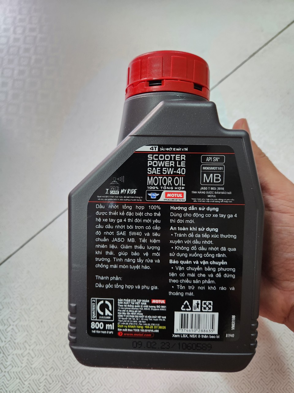 Mua tại TiktokGiới thiệu sản phẩm Nhớt cao cấp cho xe tay ga đời mới Motul Scooter Power LE 5W40 800ml tặng nhớt hộp số Motul Gear 80W90 Motul Scooter Power LE 5W40 Dầu nhớt cao cấp dành cho xe tay ga đời mới Motul Scooter Power LE 5W40 là sản phẩm dầu nhớt động cơ với chất lượng tuyệt hảo đặc chế dành riêng cho xe tay ga 4 thì. Motul Scooter Power LE 5W40,một sản phẩm cao cấp của tập đoàn dầu nhớt Motul (Pháp) đáp ứng các tiêu chuẩn cực cao của xe tay ga đời mới thông qua chứng nhận tiêu chuẩn MB. image Tính năng của dầu nhớt Motul Scooter Power LE 5W40 Motul Scooter Power LE 5W40 có tính năng kiểm soát cặn piston, chống mài mòn, chống ăn mòn cực kỳ hiệu quả với khả năng tẩy rửa tuyệt hảo giúp động cơ luôn được giữ sạch. Motul Scooter Power LE 5W40 với tính năng duy trì độ bền oxy hóa và giảm hàm lượng muội cặn hình thành, giúp chống ăn mòn và tạo bọt cực tốt. Hướng dẫn sử dụng: Motul Scooter Power LE 5W40 dành cho các sản phẩm xe tay ga đời mới sử dụng trên tất cả các loại đường: thành thị, cao tốc,… Chú ý: Motul Scooter Power LE 5W40 không thích hợp cho động cơ xe máy số 4 thì. Thời gian thay dầu mới : tùy thuộc vào hướng dẫn sử dụng của nhà sản xuất xe và theo điều kiện vận hành. Motul Scooter Power LE 5W40 không thể sử dụng ở các hệ thống mà yêu cầu tiêu chuẩn JASO MA. Công nghệ của dầu nhớt Motul Scooter Power LE 5W40