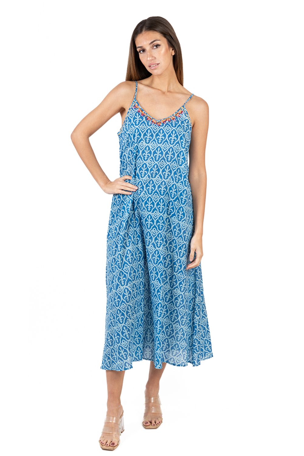Đầm Midi Cotton Isla Bonita, chất liệu cotton mềm mại, phom suông. Dài đầm 115cm (45X115cm) Phù hợp đi biển, dạo phố, công sở, hoặc dự tiệc. Hướng dẫn sử dụng: Không sử dụng chất