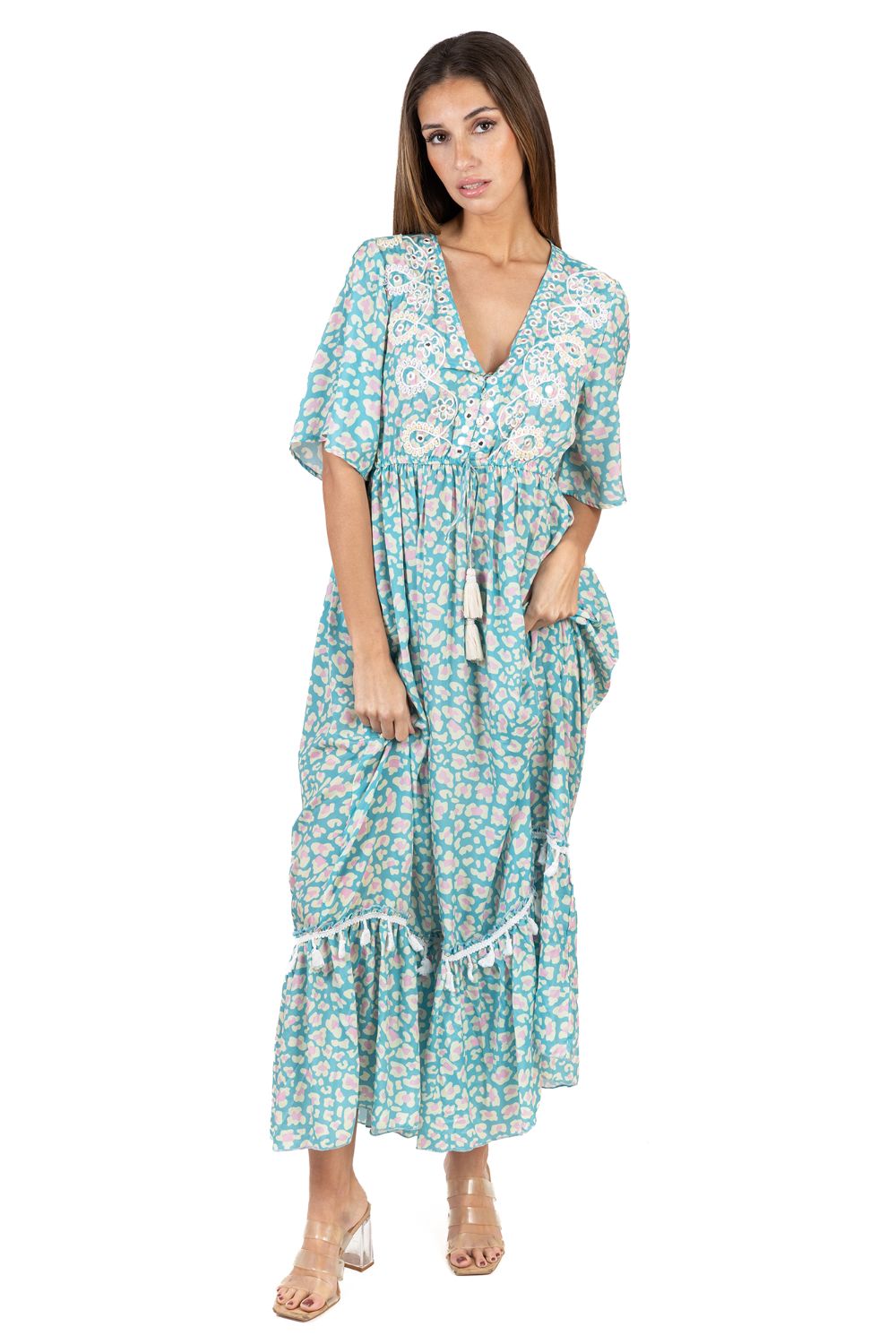 Maxi Boho Dài Tay Kết Cườm Cotton Isla Bonita, chất liệu cotton cao cấp, mềm mại, nổi bật phần ngực trước kết cườm sang trọng. Họa tiết thổ cẩm độc đáo. Phom suông. Dài Đầm