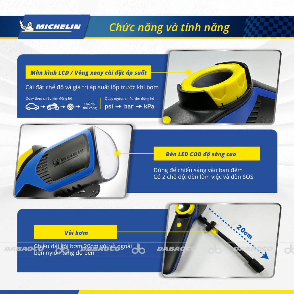 THÔNG TIN KỸ THUẬT - Tên sản phẩm: Máy bơm lốp xe đạp, xe máy, mô tô siêu tốc MICHELIN 12320 dùng pin - Model: 12320 - Công dụng: bơm hơi các loại xe đạp, xe