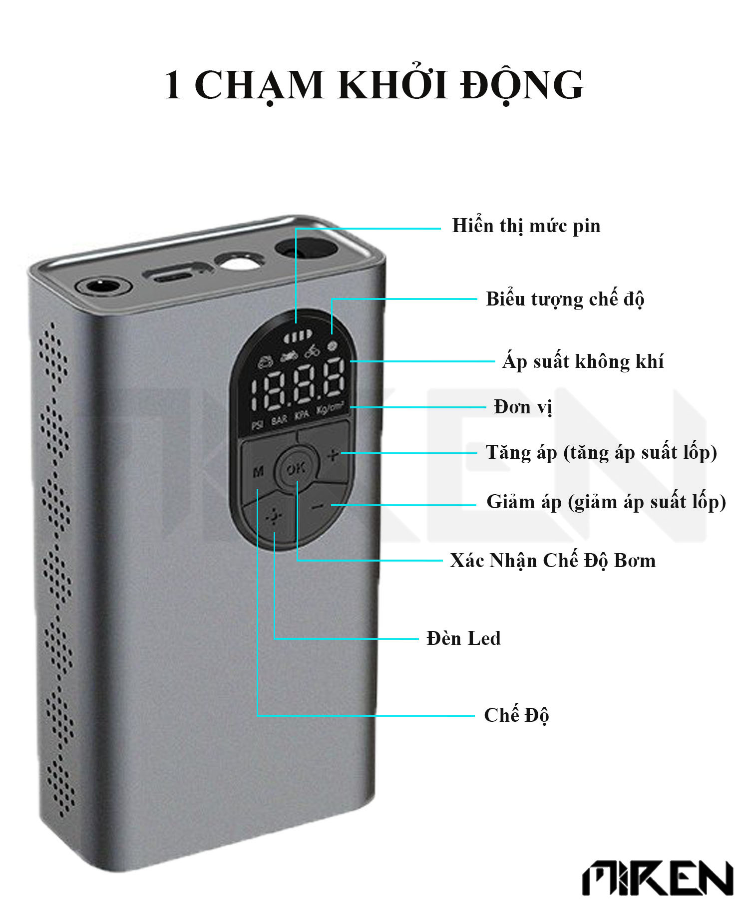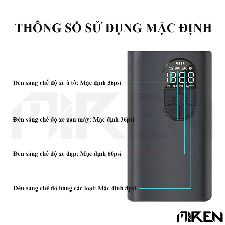 - Màn hình LED đôi hiển thị rõ ràng thông số áp suất - Cài đặt áp suất mong muốn dễ dàng, tự ngắt khi đạt mức - 4 chế độ bơm thông minh: xe hơi, xe