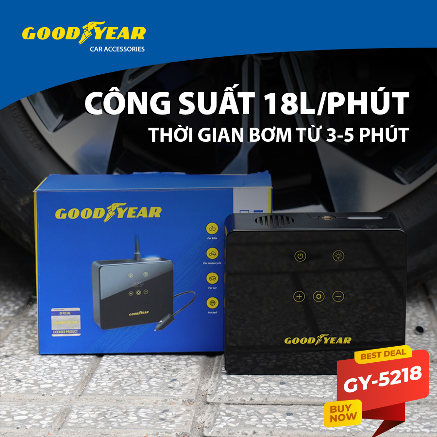 SHOP CIND XIN CHÀO QUÝ KHÁCH, CẢM ƠN QUÝ KHÁCH ĐÃ QUAN TÂM SẢN PHẨM CỦA SHOP CIND MÔ TẢ SẢN PHẨM Máy Bơm Lốp Xe GOODYEAR GY-5218 Cảm Ứng Đa Điểm Tự Ngắt Thông Minh Đặc điểm nổi bật: Máy bơm hơi chính hãng thương hiệu nổi tiếng Goodyear Màn hình hiển thị cảm ứng đa điểm, phím cảm ứng cực nhạy, giúp người dùng dễ dàng thao tác Mặt trên của bơm phủ bằng lớp kính cường lực, chắc chắn, không bám bụi, dễ vệ sinh Kích thước nhỏ gọn nhẹ, có thể dễ dàng cất gọn trong cốp xe hay dưới gầm ghế xe, được trang bị túi vải đựng chuyên dụng Dây dẫn khí được bọc Kevlar chịu được áp lực lớn, có chiều dài 62cm giúp người dùng dễ dàng thao tác ở những vị trí xa Tốc độ bơm cực nhanh, tự ngắt khi bơm đủ áp suất của lốp xe Với bốn chế độ cài đặt áp suất có thể lập trình trước, sẵn sàng bơm hơi lốp xe đạp, xe máy và ô tô cũng như một quả bóng thể thao hay phao hơi... Tích hợp đèn LED thuận tiện sử dụng trong không gian tối Sản phẩm có 2 đầu bơm khác nhau Thông số kỹ thuật: