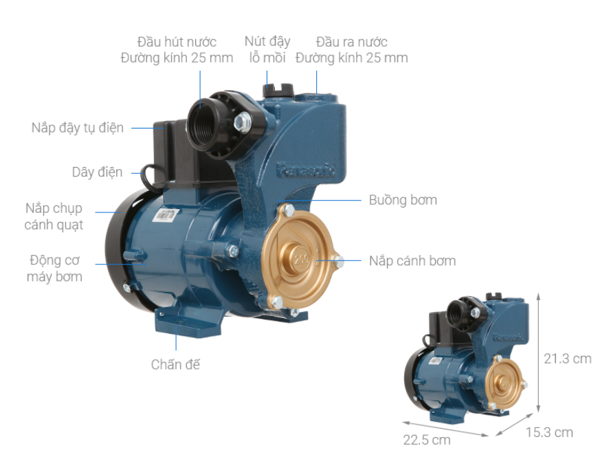 Loại máy: Đẩy cao (hút đẩy nước từ thấp lên cao) Chức năng: Hút nước và đẩy nước lên bồn chứa Công suất: 200W Lưu lượng tối đa: 45 lít/phút Đẩy/hút tối đa: Đẩy cao 21m - Hút sâu 9m Đường kính ống hút/thoát: 25mm/25mm Chuẩn chống nước: IPX4 - Chống nước bắn vào thiết bị ở mọi vị trí Kích thước - Trọng lượng: Dài 22.5 cm - Rộng 15.3 cm - Cao 21.3 cm - Nặng 7.5 kg Thương hiệu của: Nhật Bản Máy bơm nước đẩy cao Panasonic GP-200JXK-SV5 200W với kiểu dáng nhỏ gọn, hiện đại, buồng bơm được làm bằng gang, nắp buồng bơm và cánh bơm được làm bằng đồng có khả năng chịu nhiệt độ cao và ma sát, đảm bảo nước lưu thông ổn định, bên cạnh đó với thiết kế nhỏ gọn sẽ cho phép lắp đặt dễ dàng và bảo dưỡng dù ở bất kì điều kiện nào.   Máy bơm nước Panasonic nàu phù hợp sử dụng cho các hộ gia đình, nhà cao tầng có nguồn nước dưới thấp (hồ, bể chứa, bồn chứa nước) cần bơm nước đẩy lên bồn chứa nước trên sân thượng để cung cấp sử dụng nước cho các tầng, nâng cao tiện lợi trong sinh hoạt. Máy bơm nước đẩy cao Panasonic này sẽ có thể hoạt động để đáp ứng tốt nhu cầu bơm nước lên cao đáp ứng nhu cầu sinh hoạt, với công suất 200W cho lưu lượng nước tối đa bơm 45 lít/ phút, đáp ứng nhu cầu dùng các thiết bị nước đa dạng của gia đình bạn. Có khả năng hút nước từ nguồn nước sâu và đẩy lên cao với tổng độ cao hút đẩy 30 mét (hút sâu 9 m, đẩy cao lên 21 m), máy bơm nước này phù hợp dùng cho nhà từ 3 - 4 tầng, giúp bơm nước nhanh và mạnh từ nguồn lên bồn chứa. Máy bơm gia đình được hãng trang bị chuẩn chống nước IPX4, điều này nghĩa là máy có thể kháng nước nếu bị nước bắn vào bất kì vị trí nào, giúp an toàn nhất cho động cơ tránh vào nước. Ngoài ra máy còn được trang bị thêm 2 lớp cách nhiệt đến 130⁰C đảm bảo an toàn, chống chập điện, chống ăn mòn và ngắn mạch, bảo vệ tối ưu cho sản phẩm.   Với dòng máy bơm này, khi nhiệt độ cao trên 130⁰C, máy sẽ tự ngắt an toàn, cộng với lõi quay motor còn được phủ lớp chống rỉ sét đảm bảo máy hoạt động liên tục 8000 giờ không ngừng nghỉ, vô cùng bền bỉ.   Bên cạnh đó, với cánh bơm được thiết kế di động có khả năng tự do dịch chuyển dọc theo trục bơm, giúp ngăn ngừa khả năng cánh bơm bị kẹt vào buồng bơm do sỏi, cát lọt vào, giúp bảo vệ máy tránh hư hại tối đa. Nhìn chung, Máy bơm nước đẩy cao Panasonic GP-200JXK-SV5 200W phù hợp sử dụng cho gia đình đang có nguồn nước dưới thấp, cần đẩy lên bồn chứa trên cao để tiện cho việc sử dụng nước, với việc trang bị nhiều tính năng an toàn, bảo vệ sản phẩm như chống nước, cách nhiệt, tự ngắt điện... chắc chắc sản phẩm sẽ là thiết bị có khả năng sử dụng ổn định, bền bỉ cùng nâng cao chất lượng cuộc sống cho gia đình. Lưu ý khi sử dụng máy bơm nước Panasonic