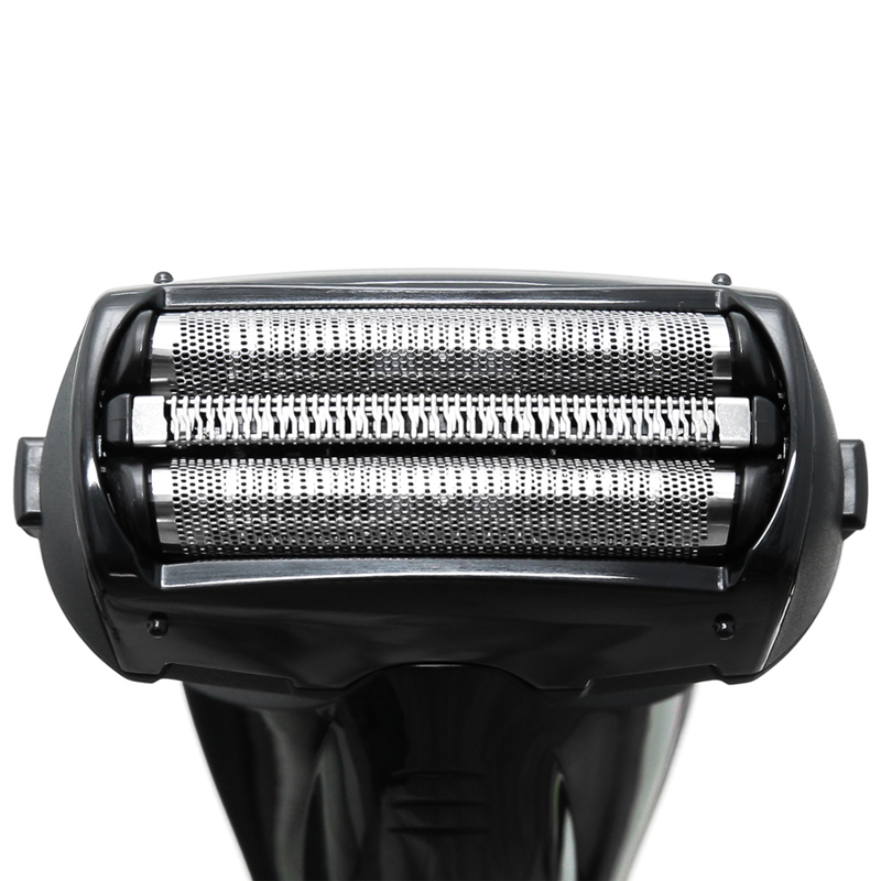 Máy cạo râu với hệ thống 3 lưỡi cạo, lưỡi cắt hình cung với các lá cắt bên ngoài hình tròn giúp tiếp cận mọi góc cạnh trên da mặt, cạo thật sát, thật sạch mà an toàn trên da Lưỡi trong 30 độ với công nghệ nano giúp cắt phần thân râu để có thể cạo sát hơn.