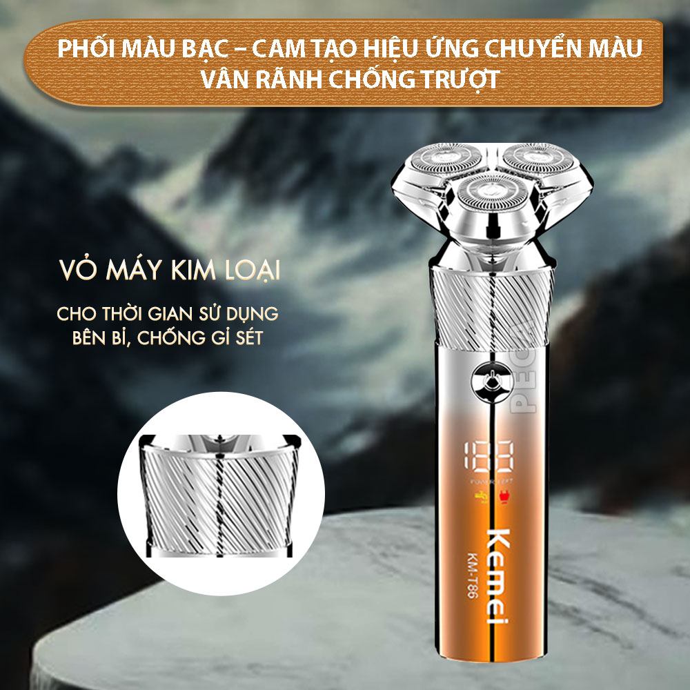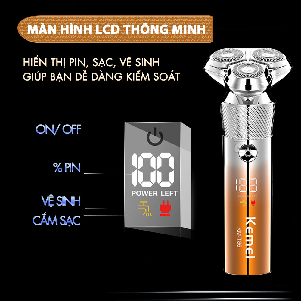 Máy cạo râu Kemei KM-T86 được trang bị màn hình LCD hiện đại, cung cấp thông tin cần thiết cho người dùng và tăng cường trải nghiệm sử dụng: Hiển thị phần trăm pin, vệ sinh, cảnh báo sạc.