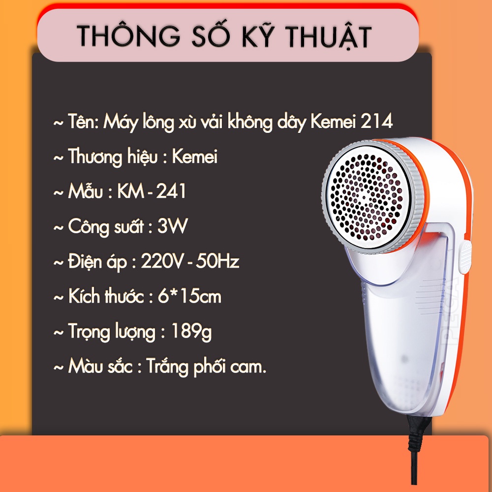 ✨Máy cắt lông xù vải Kemei Km-241 chuyên dụng cắt lông xù quần áo, ga nệm nhanh chống sử dụng dây sạc tiện lợi - Hàng chính hãng