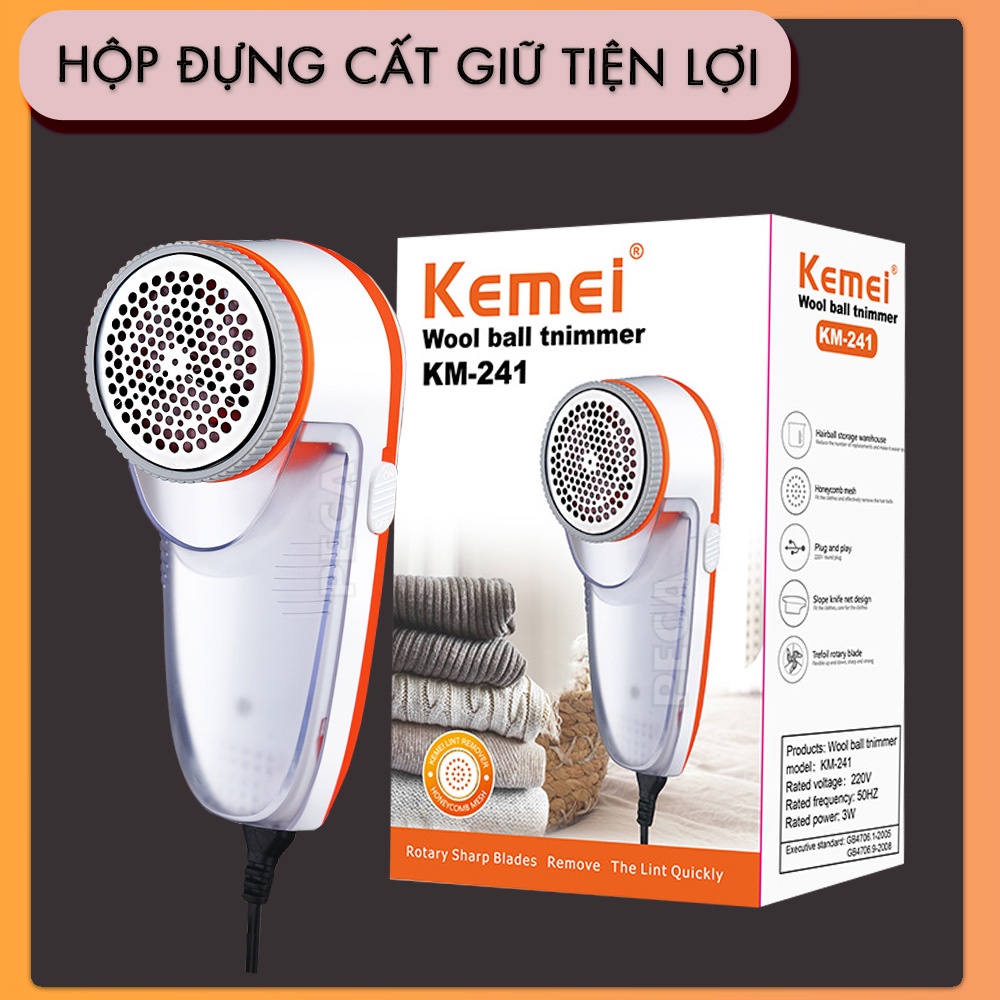 MÁY DUỖI CẮT LÔNG XÙ CHÍNH HÃNG KEMEI KM-241 Trong cuộc sống hằng ngày việc bảo quản quần áo là một việc cần thiết và thiết yếu, giúp bạn tiết kiệm chi phí cho việc mua sắm cũng như giữ quần áo luôn mới, đặc biệt là những món đồ yêu thích. Máy cắt lông xù Kemei KM-241 sẽ là giải pháp cho bà nội trợ thông thái và các thợ may chuyên nghiệp. ƯU ĐIỂM NỔI BẬT : MÁY CẮT LÔNG XÙ ĐIỆN KEMEI KM-241 Thiết kế 3x lưỡi cắt vòng xoay tròn linh hoạt , giúp cho đường cắt sắc bén, chính xác , loại bỏ những vụn vải, lông xù đáng ghét 1 cách nhanh chóng và gọn gàng.
