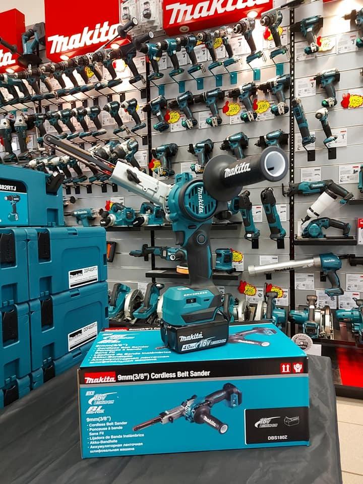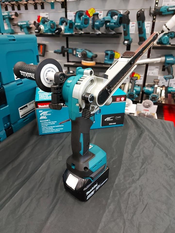 Trong hộp có: Máy chà nhám Makita DBS180Z, Nhám băng 9X533-AA80 (2 cái), đế kẹp tay cầm, tay cầm 36. Máy chưa bao gồm pin và sạc.