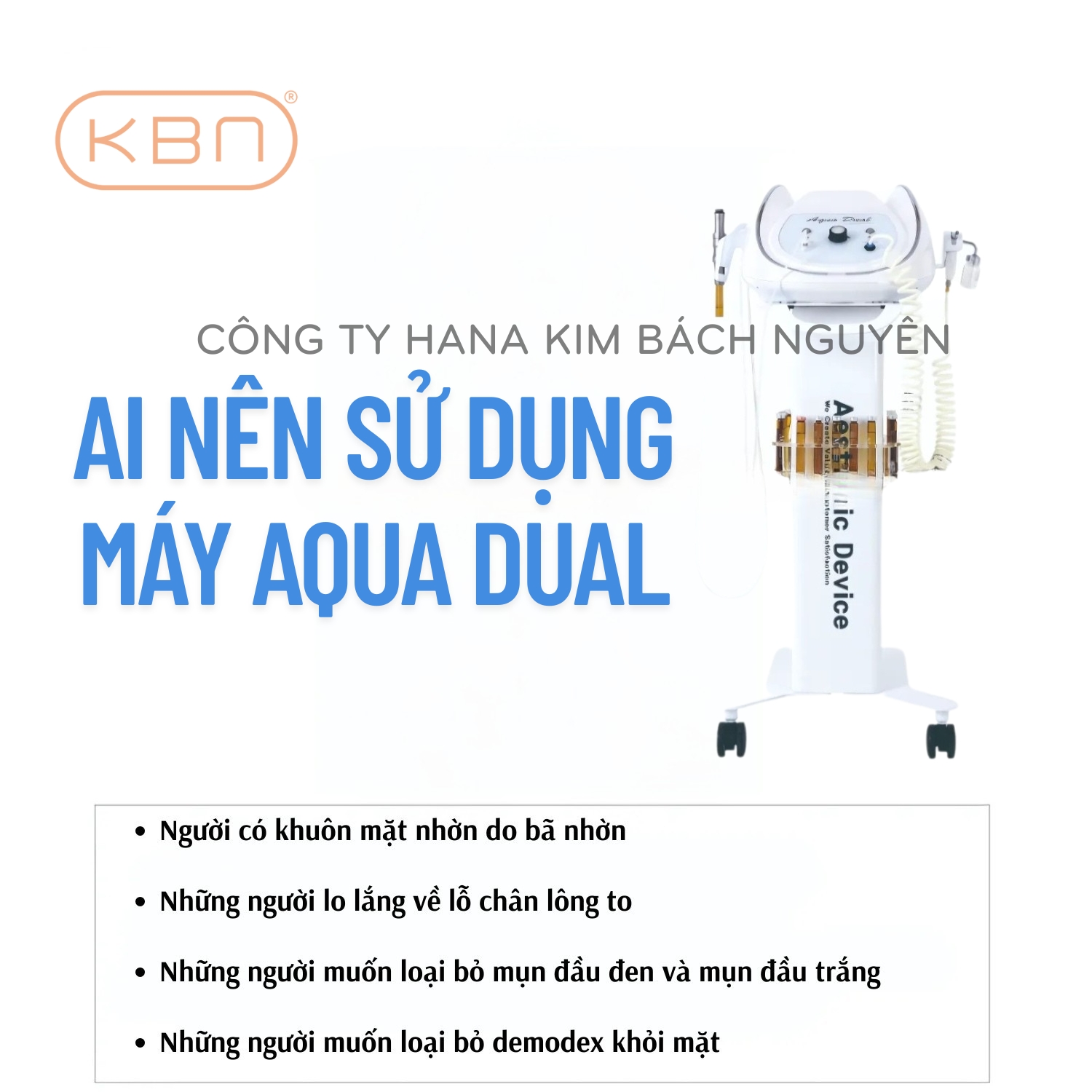 - Giới thiệu tổng quan về máy AQUA DUAL Máy chăm sóc da mặt Aqua Dual là thiết bị thẩm mỹ cao cấp đến từ Hàn Quốc, ứng dụng công nghệ Aqua Peel tiên tiến. Thiết bị này chuyên dùng để làm sạch sâu, loại bỏ tế bào chết, hút bã nhờn, cung cấp độ ẩm, đồng thời cải thiện sắc tố da và làm sáng da một cách an toàn, nhẹ nhàng.