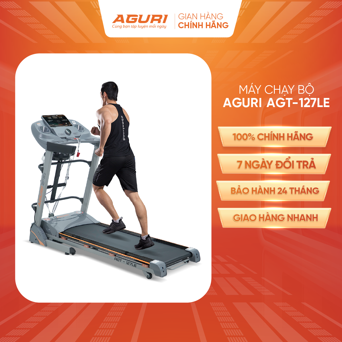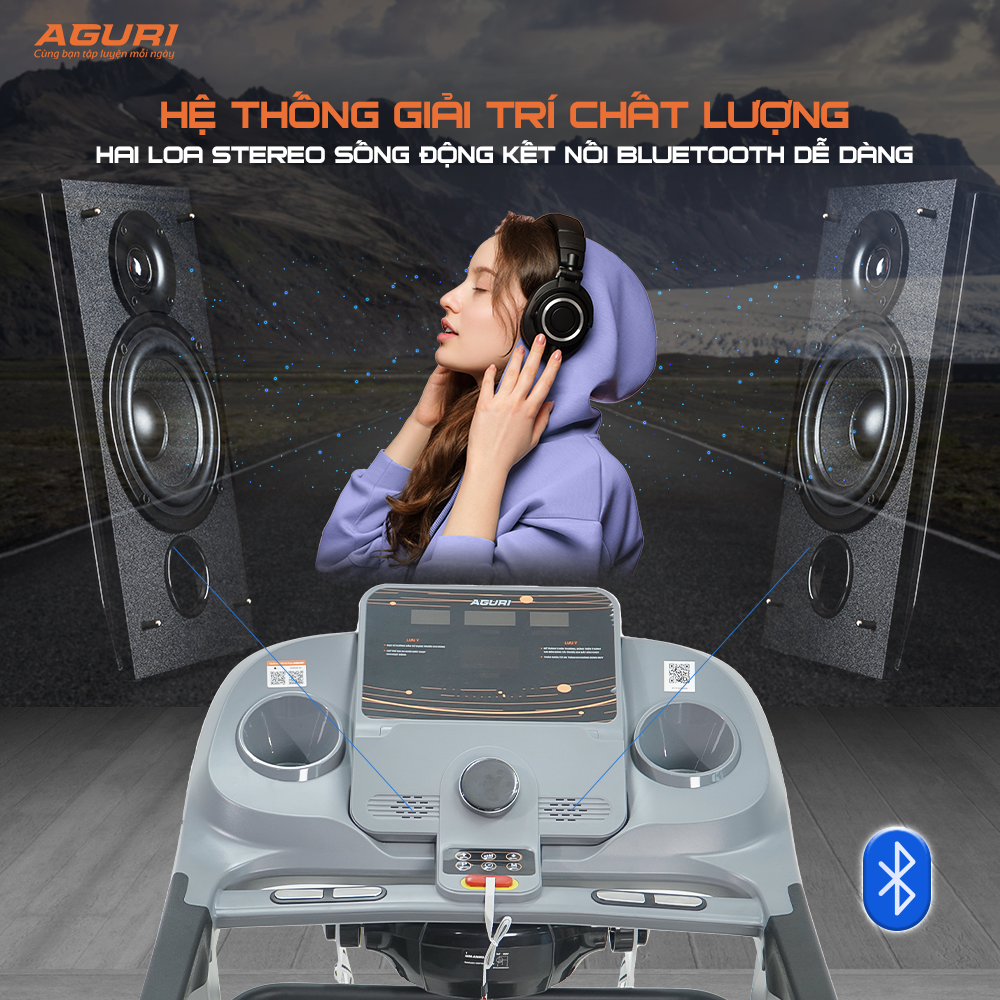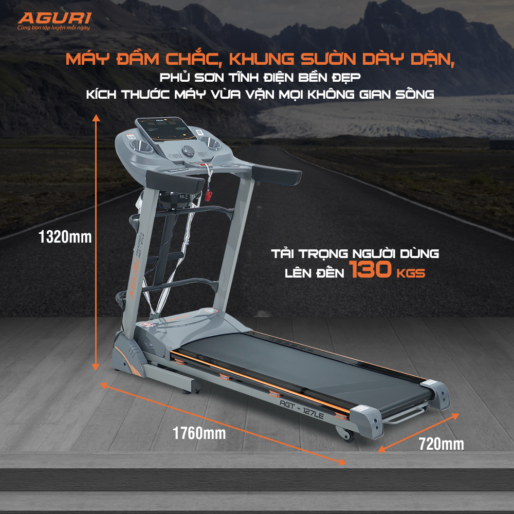Máy chạy bộ AGURI AGT-127LE - máy chạy bộ tại nhà Đây là máy chạy bộ chính hãng của thương hiệu AGURI - Máy tập của Cầu thủ Công Phượng. Là mẫu máy chạy bộ giá tốt được nhiều người tiêu dùng lựa chọn. Một mẫu máy chạy bộ gấp gọn dễ dàng, tiết kiệm không gian cho người dùng. > THÔNG SỐ KỸ THUẬT: - Motor DC công suất 3.5HP - Tốc độ: 1.0km/h – 16km/h - Chương trình mặc định: P1-P24 - Kích thước đặt máy (dài-rộng-cao): 1760*720*1320mm - Kích thước đóng thùng: 1780*760*325mm - Diện tích băng tải: 450*1350mm - Trọng lượng người dùng tối đa: 130 kgs - N.W/G.W: 80/90kg > MÔ TẢ SẢN PHẨM: - Màn hình LED 5 cửa số hiển thị: thời gian, quãng đường, vận tốc, nhịp tim, calories, chương trình mặc định - Máy có piston thủy lực nâng đỡ, có thể gập gọn máy khi không sử dụng, bàn chạy có tay cầm để dễ dàng nhấc bàn chạy lên - Máy có bánh xe di chuyển rất dễ dàng - Máy được trang bị 1 đầu massage, đánh mỡ bụng ; bộ phận gập bụng - Có hệ thống giảm sóc khi hoạt động, kết nối Bluetooth, hệ thống 2 loa stereo - Có chức năng đo chỉ số cơ thể (Body fat) > CHÍNH SÁCH BẢO HÀNH, BẢO TRÌ: - Bảo hành chi tiết máy lên tới 5 năm. Cụ thể: