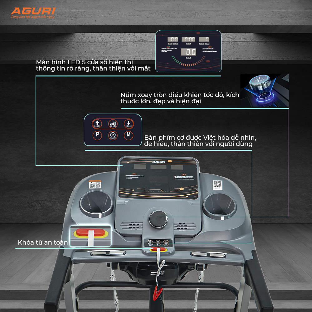 Máy chạy bộ AGT-117LE AGURI *Thông tin sản phẩm. - Motor DC công suất 3.0HP - Màn hình LED 6 cửa số hiển thị: thời gian, quãng đường, vận tốc, nhịp tim, calories, chương trình